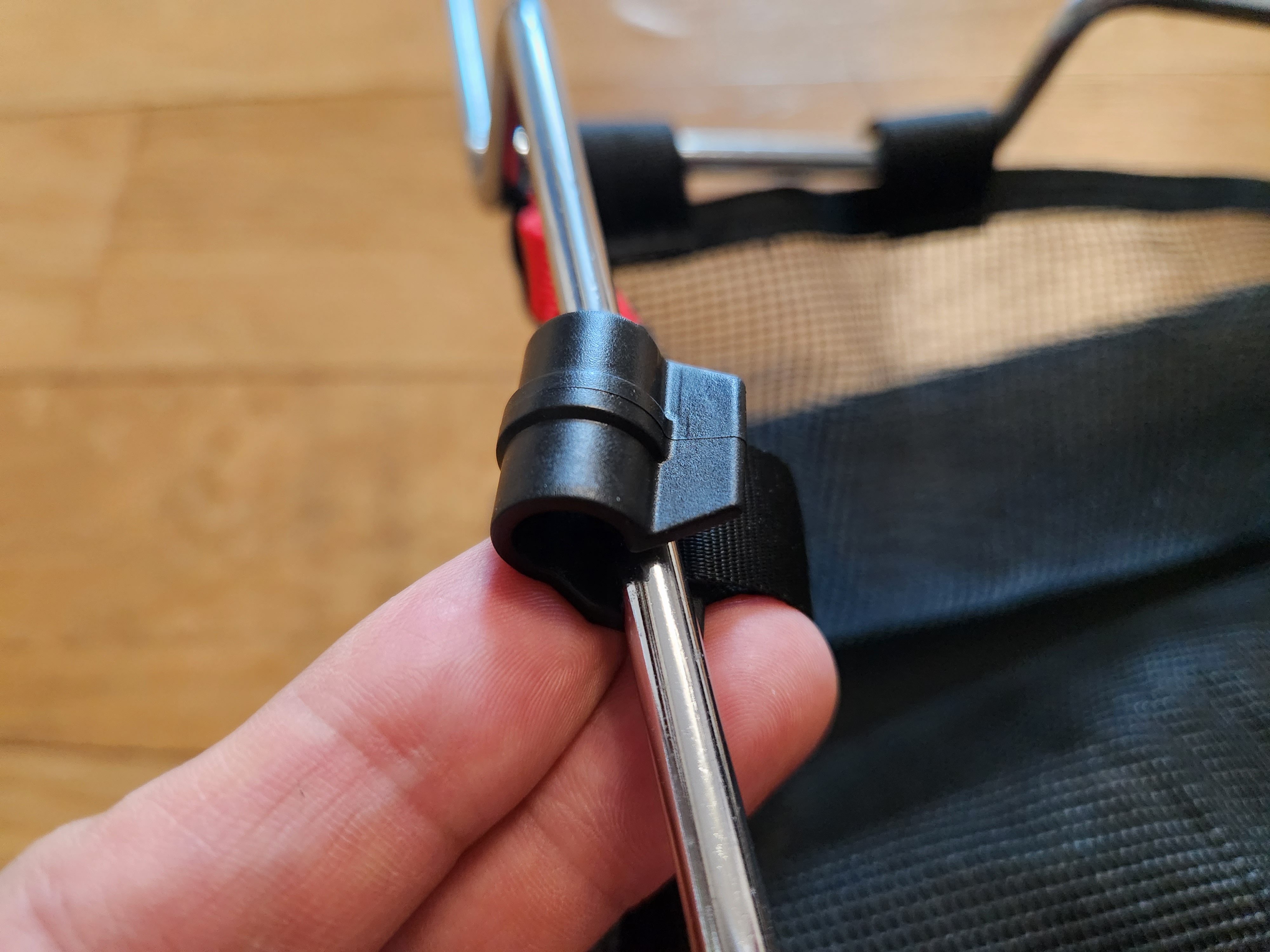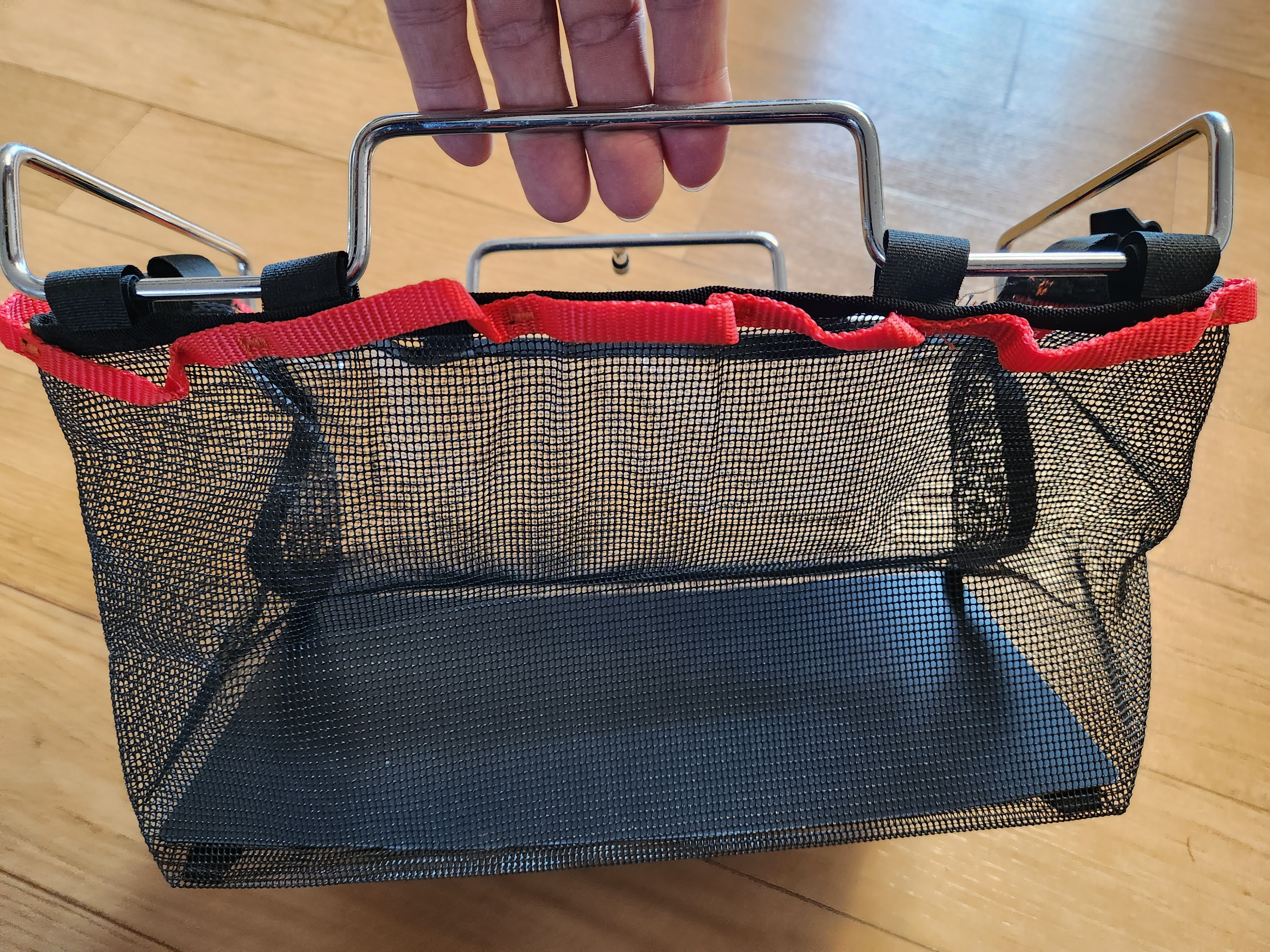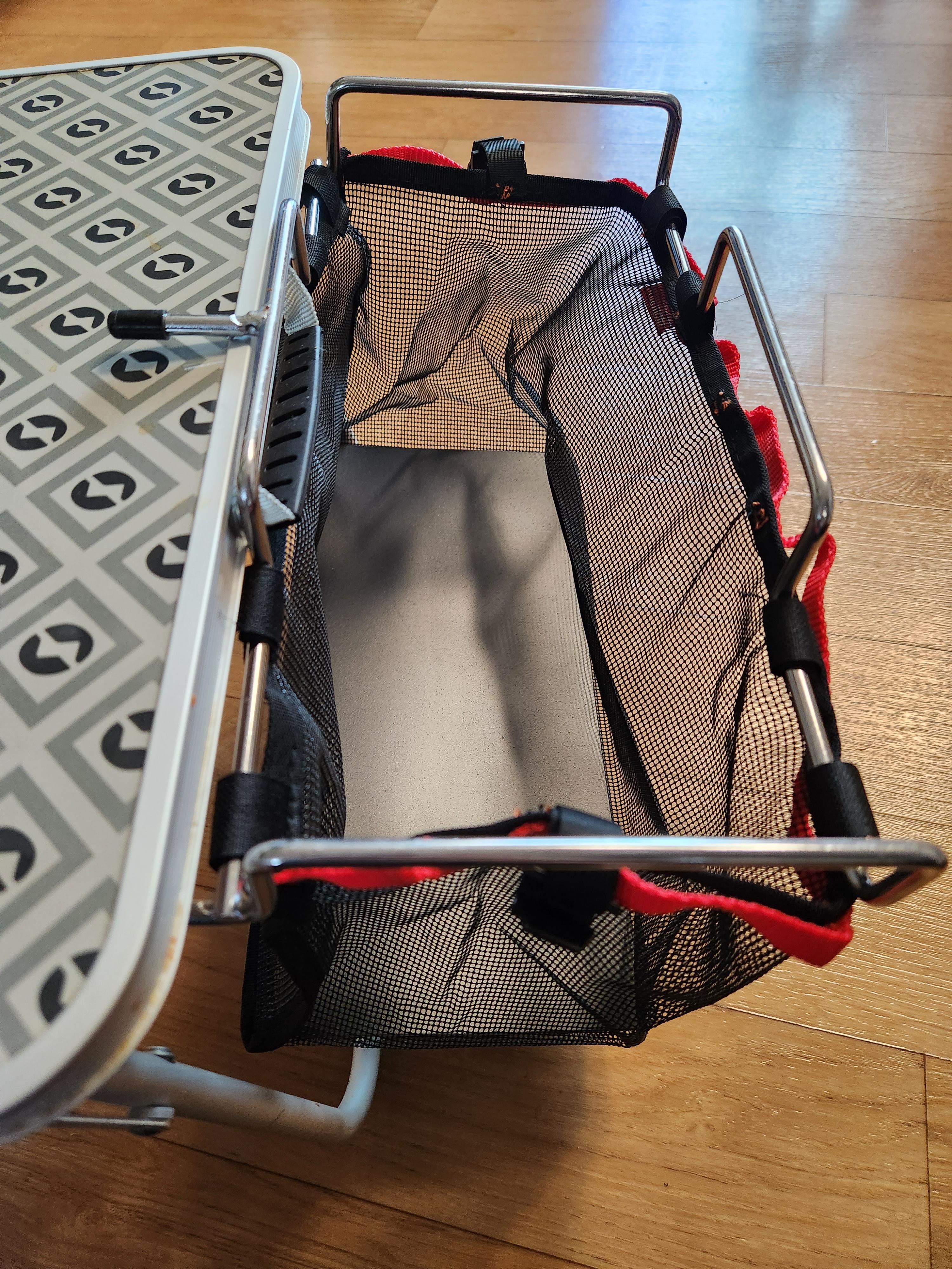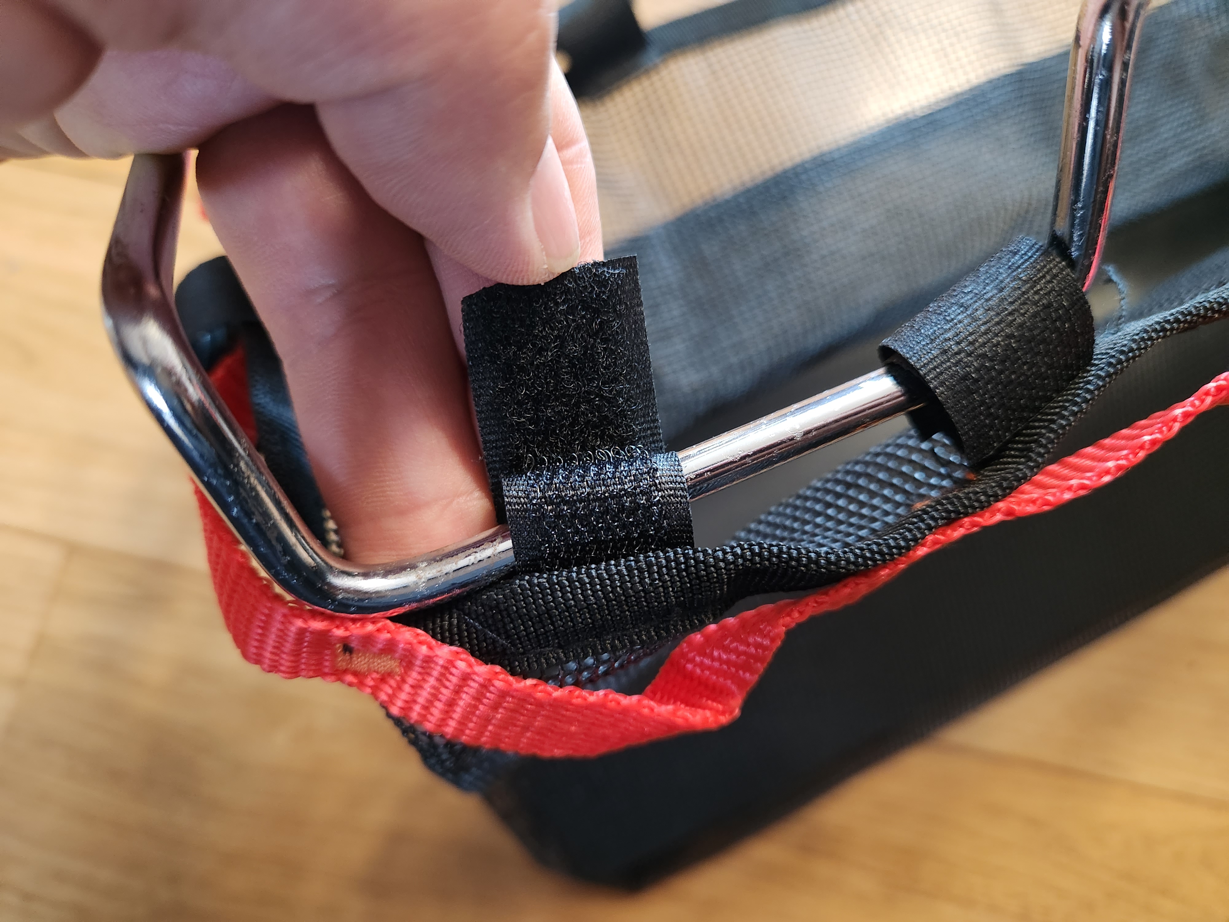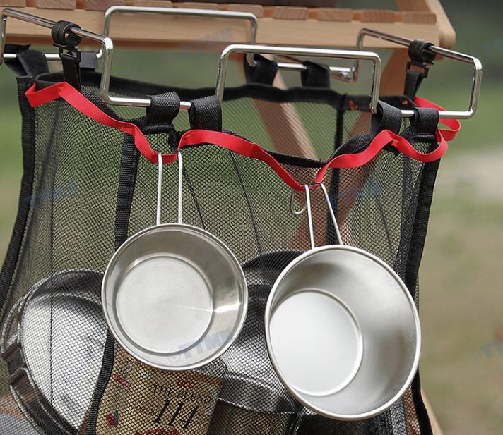 바스켓을 걸 수 있는 봉지걸이 프레임에 찍찍이 형태의 벨크로를 체결하여 줍니다. 체결하게 되면 사진과 같이 이런 모양이 됩니다. 사이드 쪽은 스트랩형태로 시에라컵이나 조리도구를 걸어서 사용할 수 있습니다.