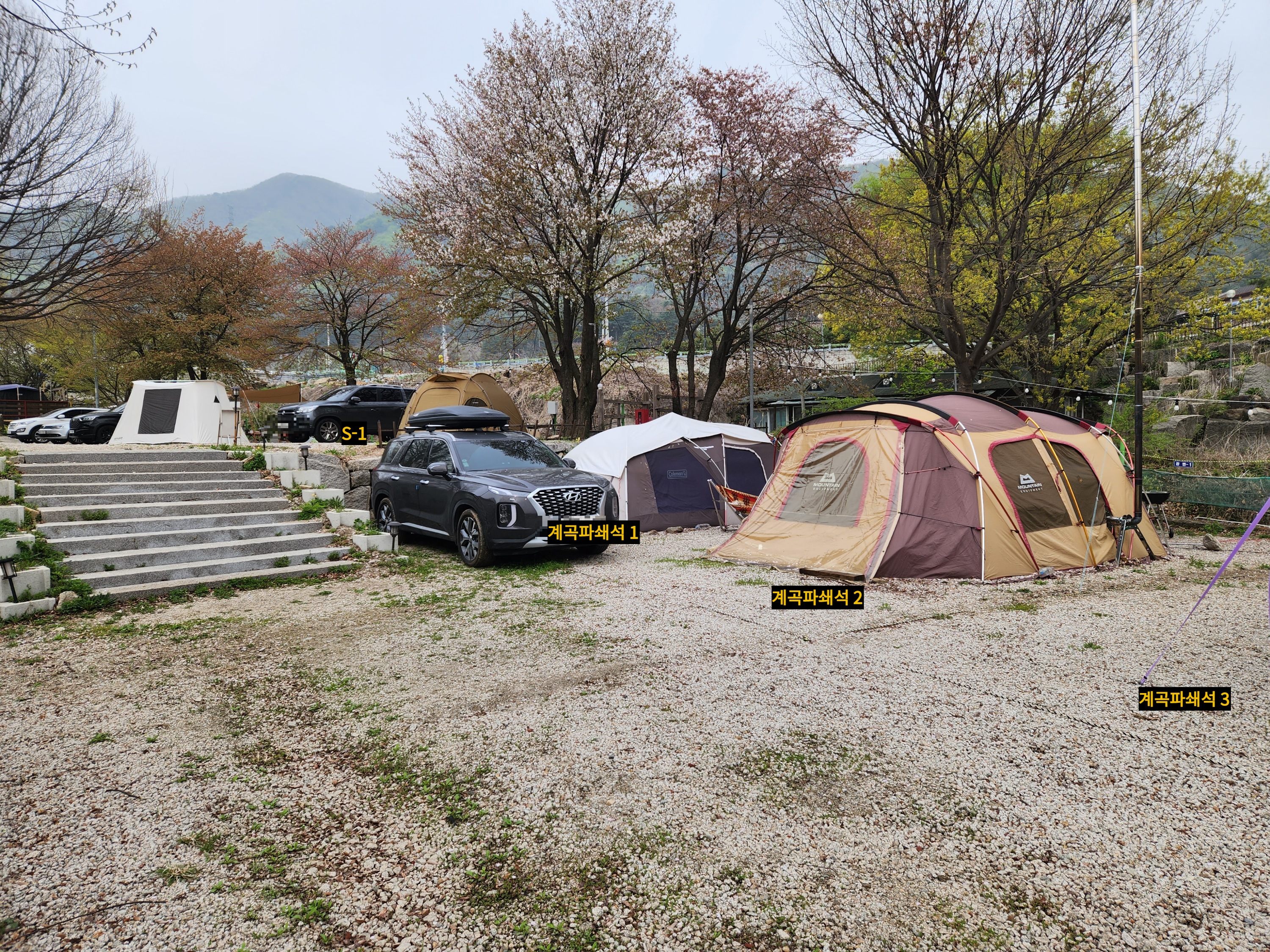깊이울캠핑장은 큰 데크(720X540cm) 5개, 작은 데크(540X360cm) B사이트 5개, C사이트 5개, 계곡 쪽 S파쇄석 2개, 계곡 파쇄(1000X900 cm) 5개, 산아래 파쇄석(1000X900 cm) 5개로 총 27개 사이트로 구성되어 있는 곳입니다. 캠핑장 입구로 들어가면 정면에 바로 보이는 사이트가 A-4, 바로 뒤편이 A-5, 그 옆이 S-2, 오른쪽 사이트는 A-1, A-2, A-3 순서대로 사이트를 확인할 수 있습니다.