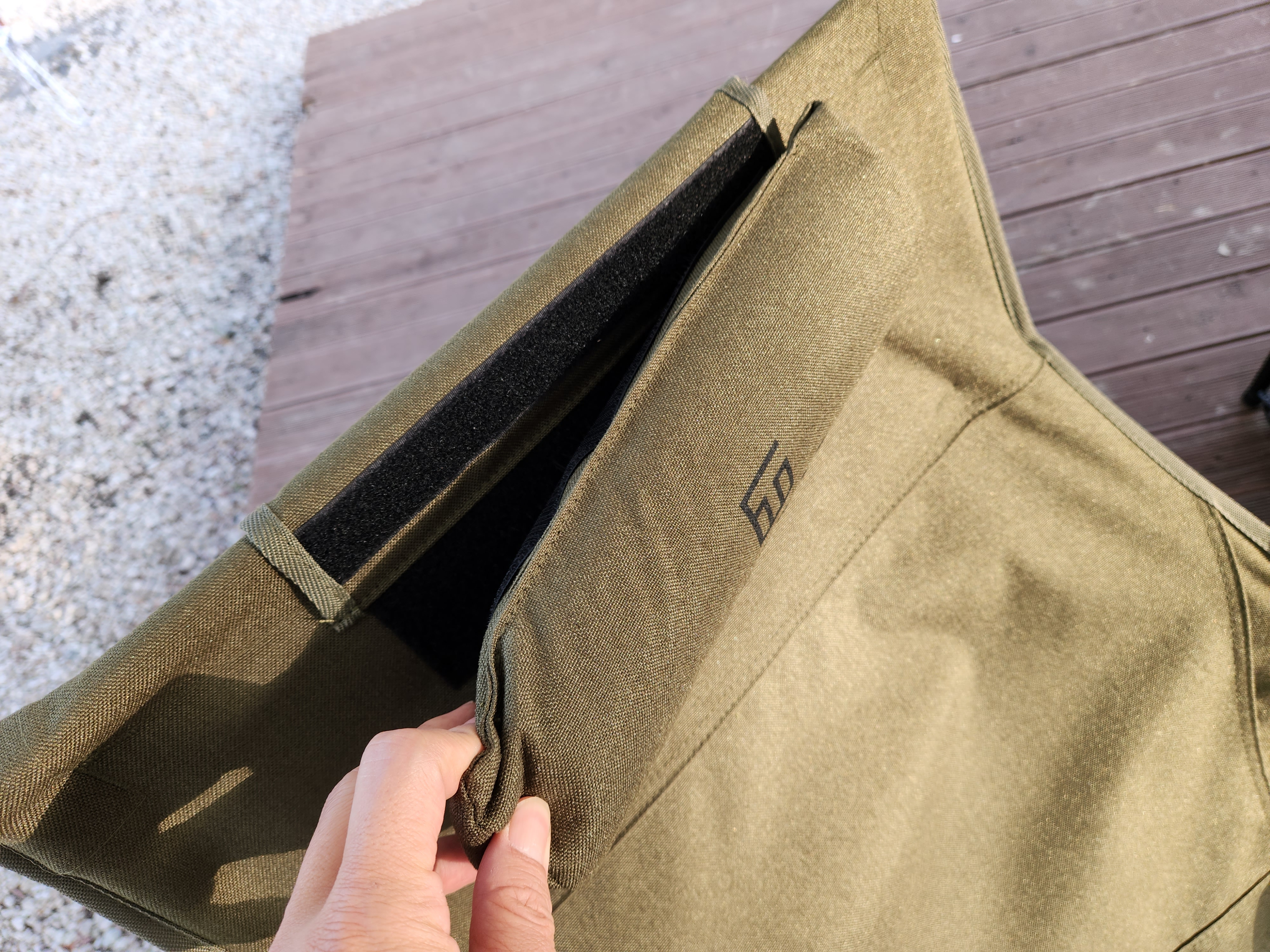 체어 스킨으로 프레임을 감싸 가방 안에 넣으면 간편하게 정리가 됩니다. 납작하고 네모난 형태로 수납이 되는 구조입니다.
