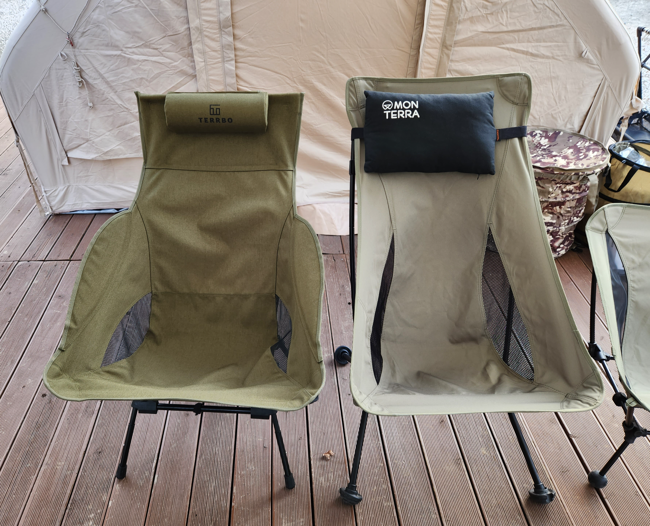 기존에 가지고 있던 몬테라 CVT2 L사이즈와 비교샷입니다. CVT2 L에 비해 폭은 더 넓고 높이는 약간 더 낮은 모습입니다. 둘 다 카키 색상이지만 색감은 테르보 체어가 훨씬 짙은 녹색에 가까운 편입니다. 저의 기준으로 착좌감은 테르보 브랜드가 훨씬 더 편안해서 좋았습니다.