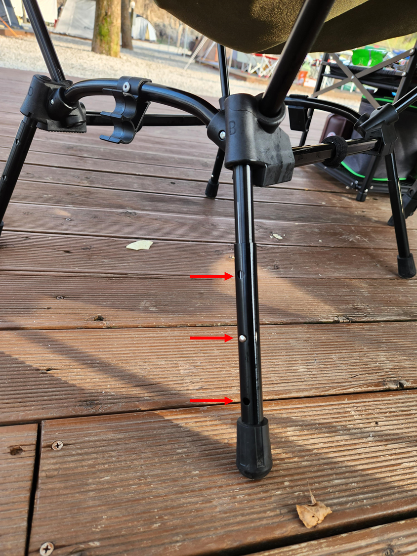 체어의 다리 부분은 총 4개로 구성되어 있고 다리의 높이는 버튼을 눌러서 3단계로 조절이 가능한 체어입니다.