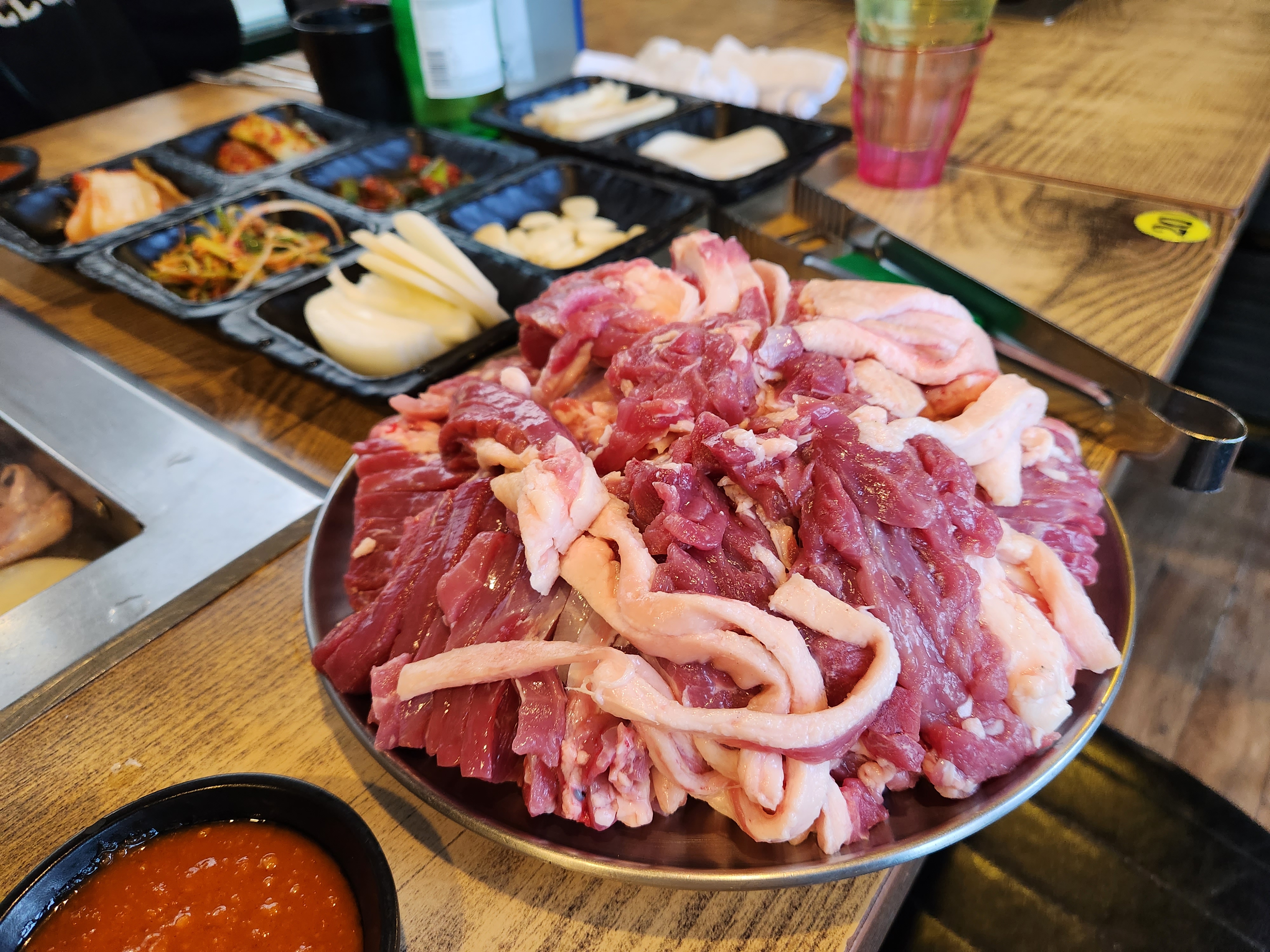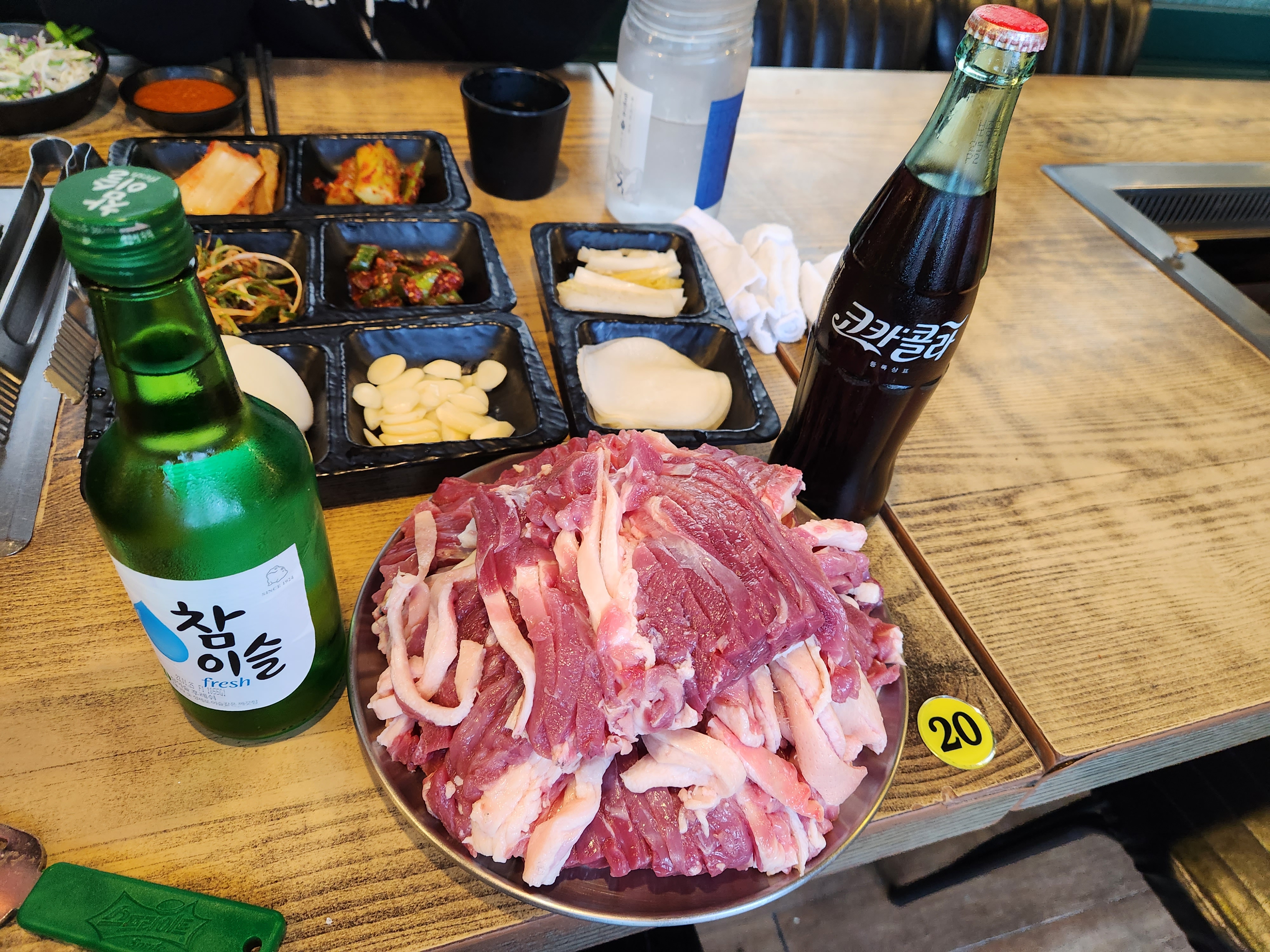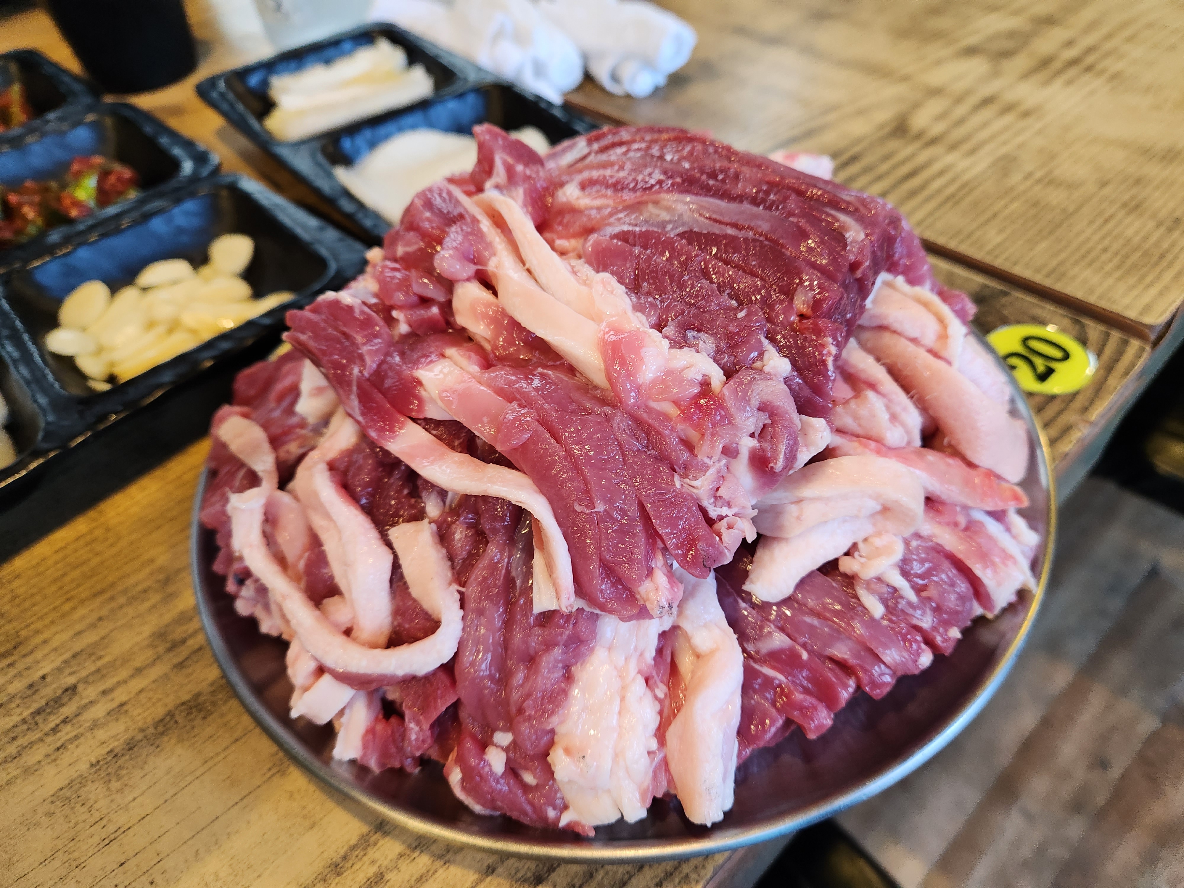 기본으로 깔리는 밑반찬들입니다. 오이무침, 김치, 백김치, 파절이, 고추절임, 쌈무가 깔리고 같이 구워 먹도록 감자, 마늘을 가져다주십니다. 이 집은 정말 반찬이 예술입니다. 백김치, 오이무침, 파절이, 고추절임 등 반찬이 고기의 느끼함을 싹 잡아줍니다.