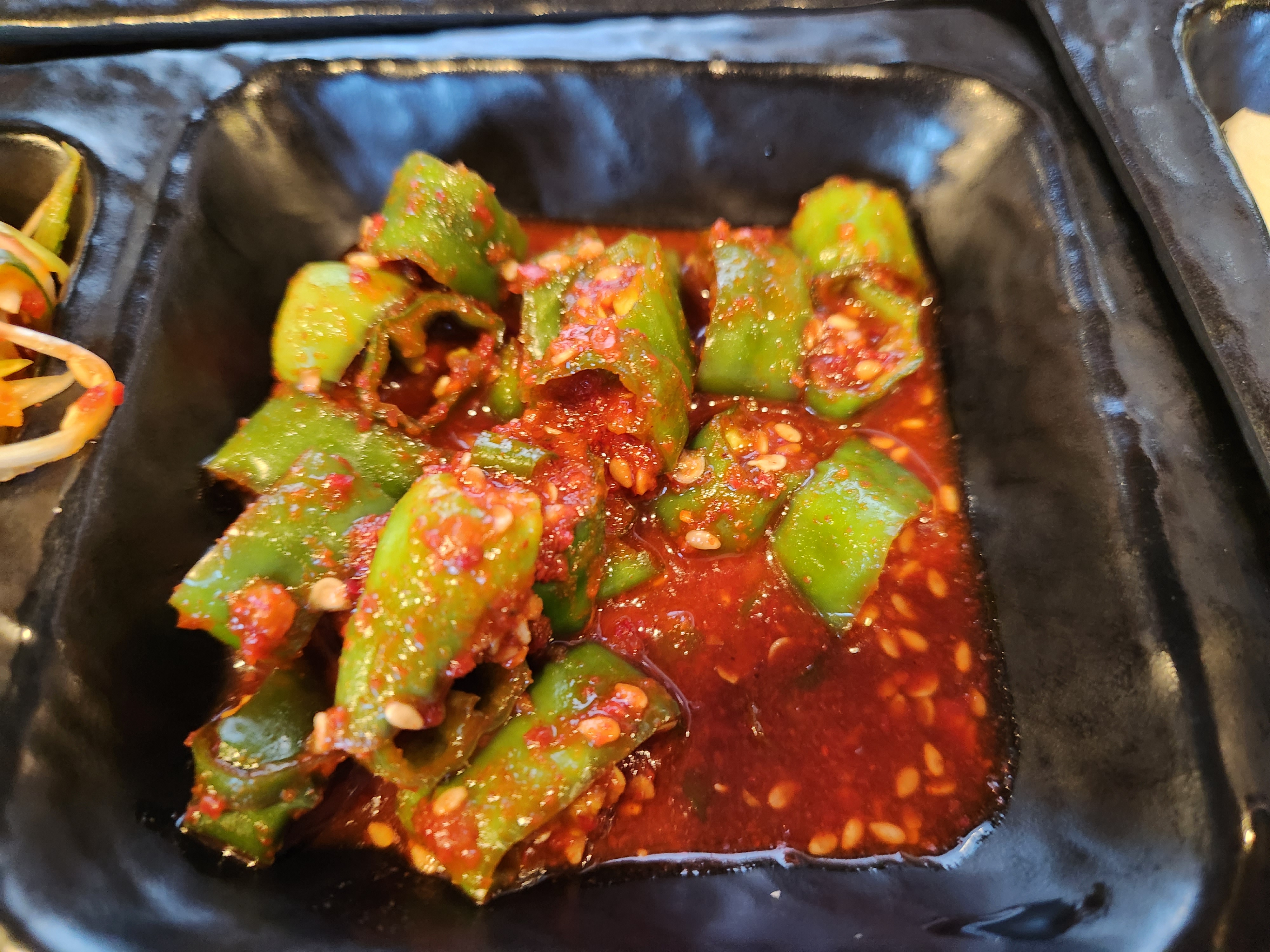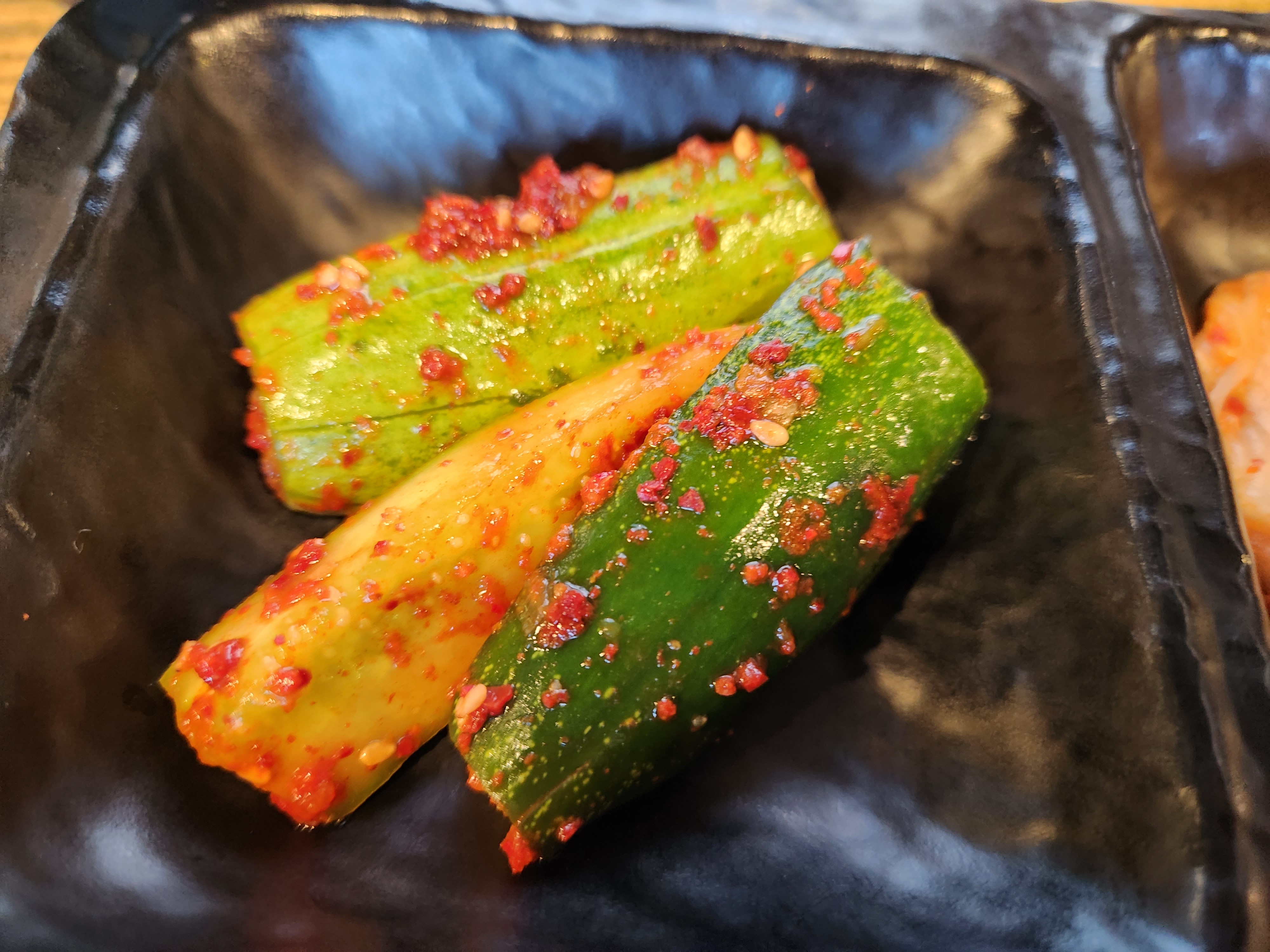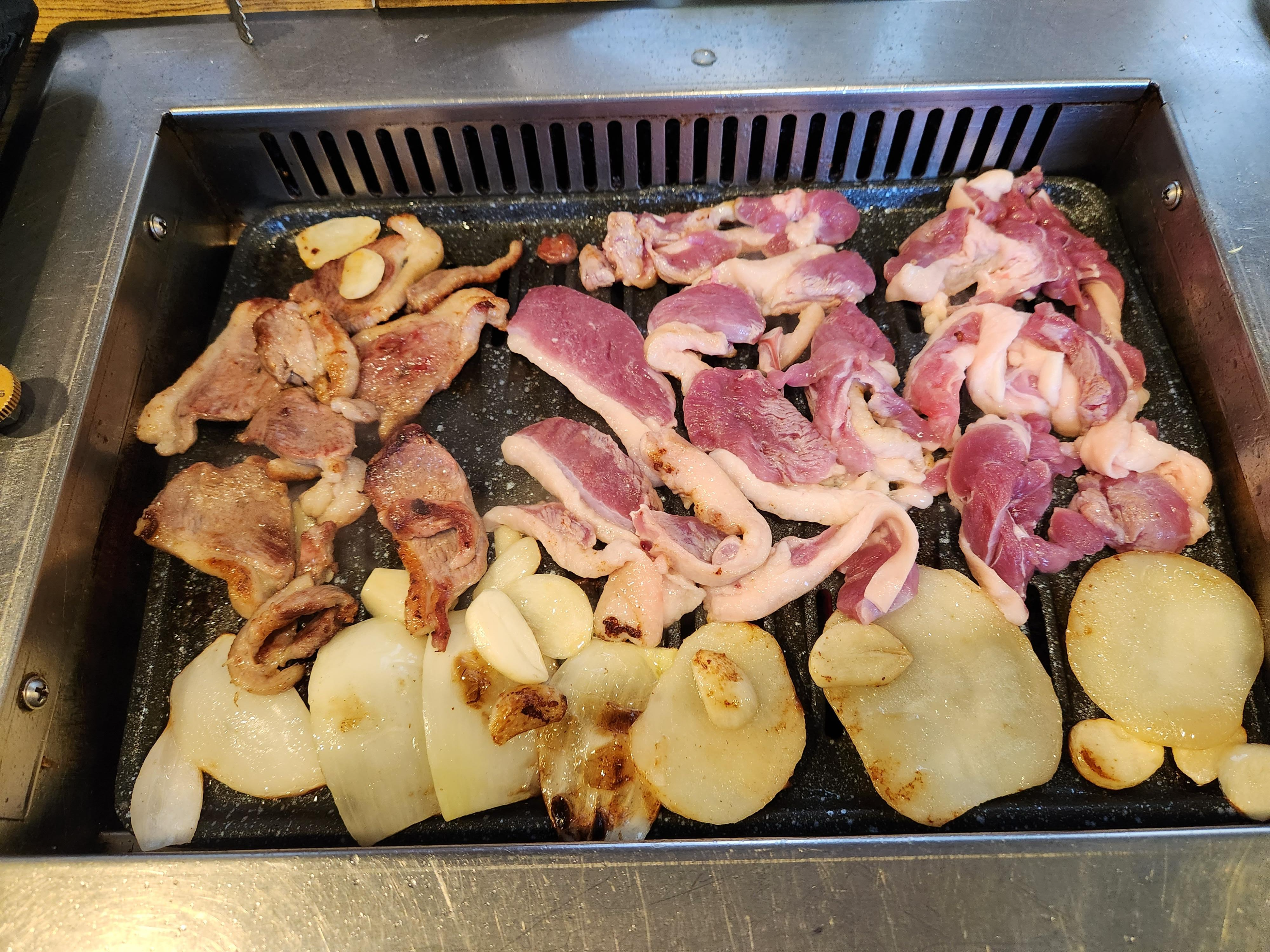 기본으로 깔리는 밑반찬들입니다. 오이무침, 김치, 백김치, 파절이, 고추절임, 쌈무가 깔리고 같이 구워 먹도록 감자, 마늘을 가져다주십니다. 이 집은 정말 반찬이 예술입니다. 백김치, 오이무침, 파절이, 고추절임 등 반찬이 고기의 느끼함을 싹 잡아줍니다.