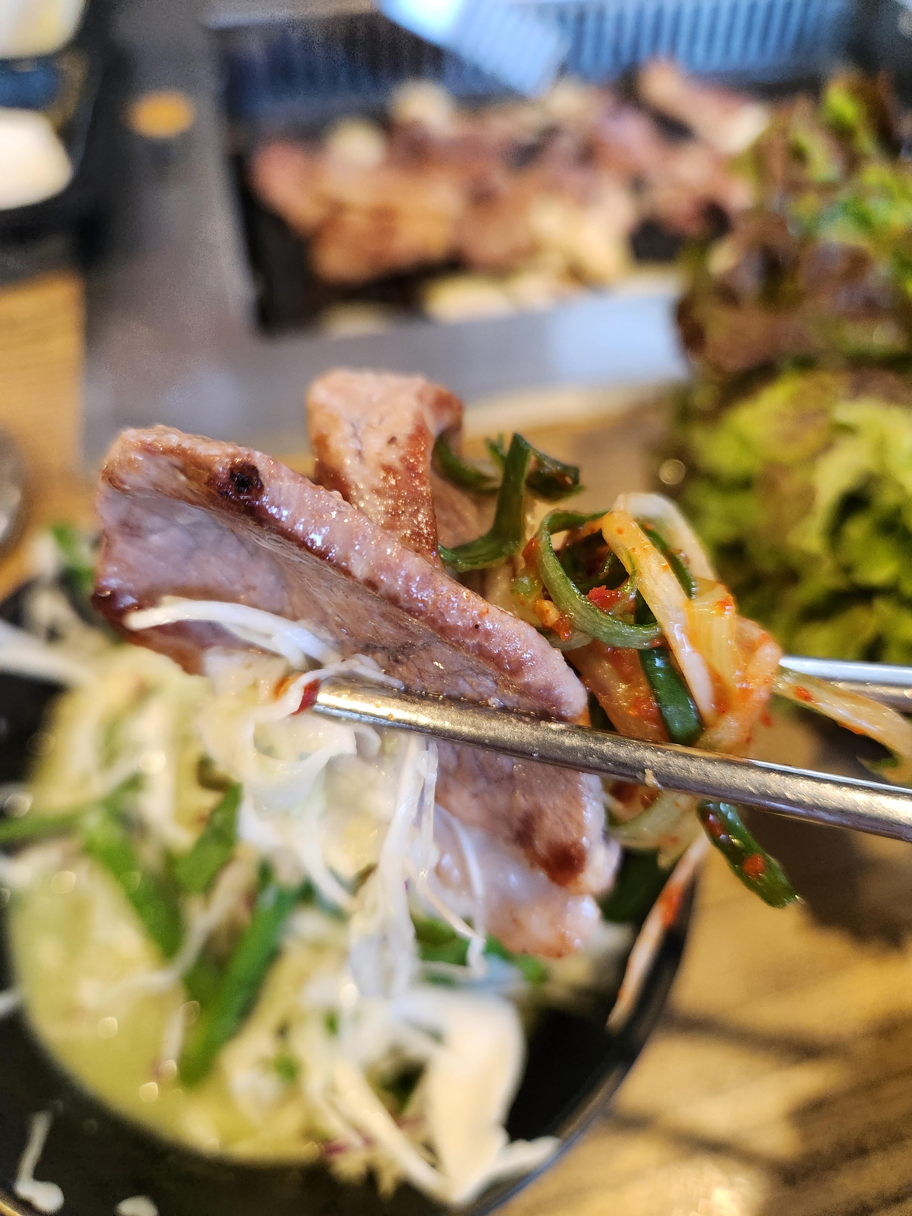 고기와 파절이를 같이 싸서 한입 먹으면 기분이 좋아집니다.