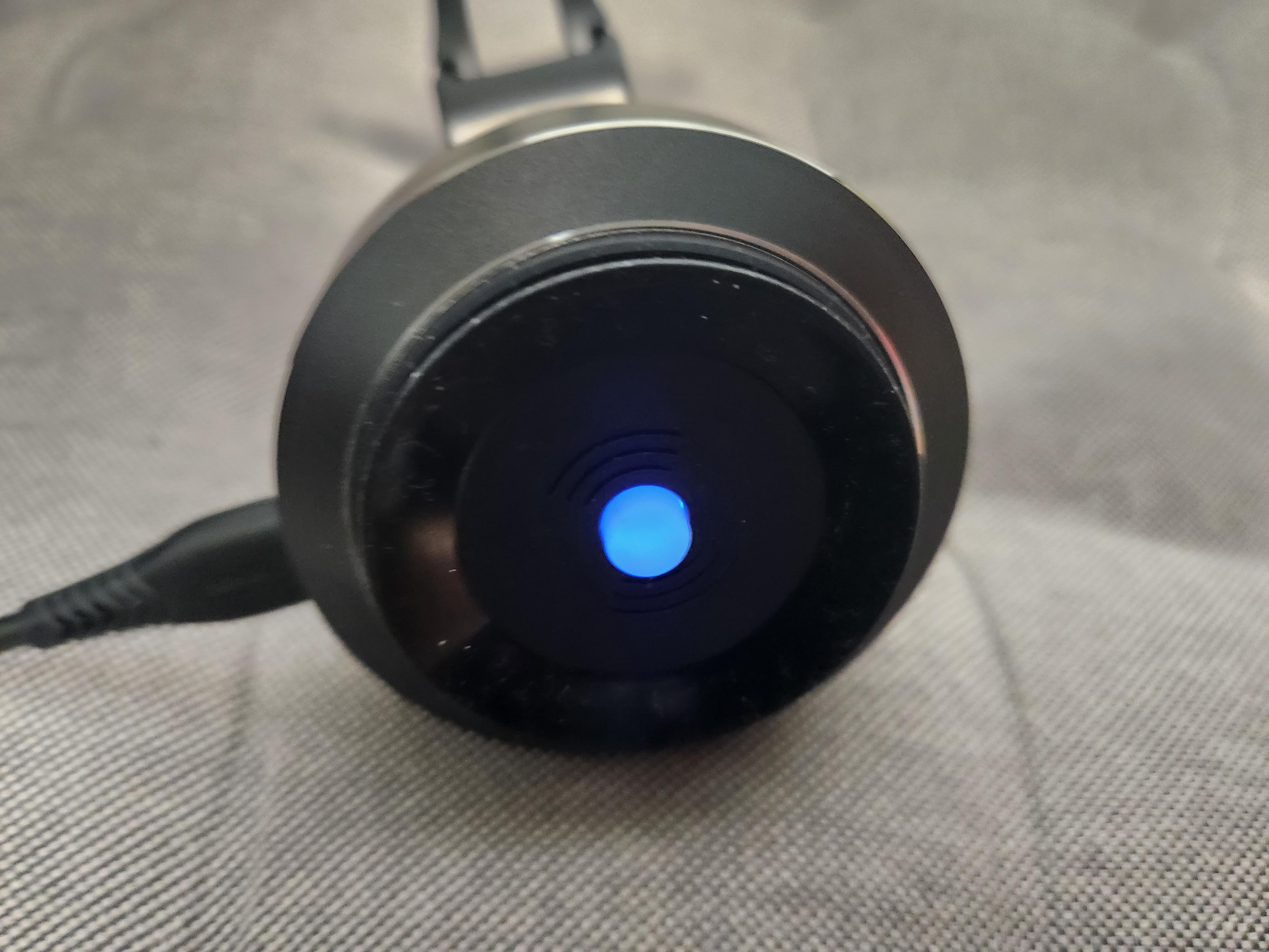 본품의 배터리가 충전이 완료되면 점멸되지 않고 중앙에 파란 불빛이 들어와 있습니다.