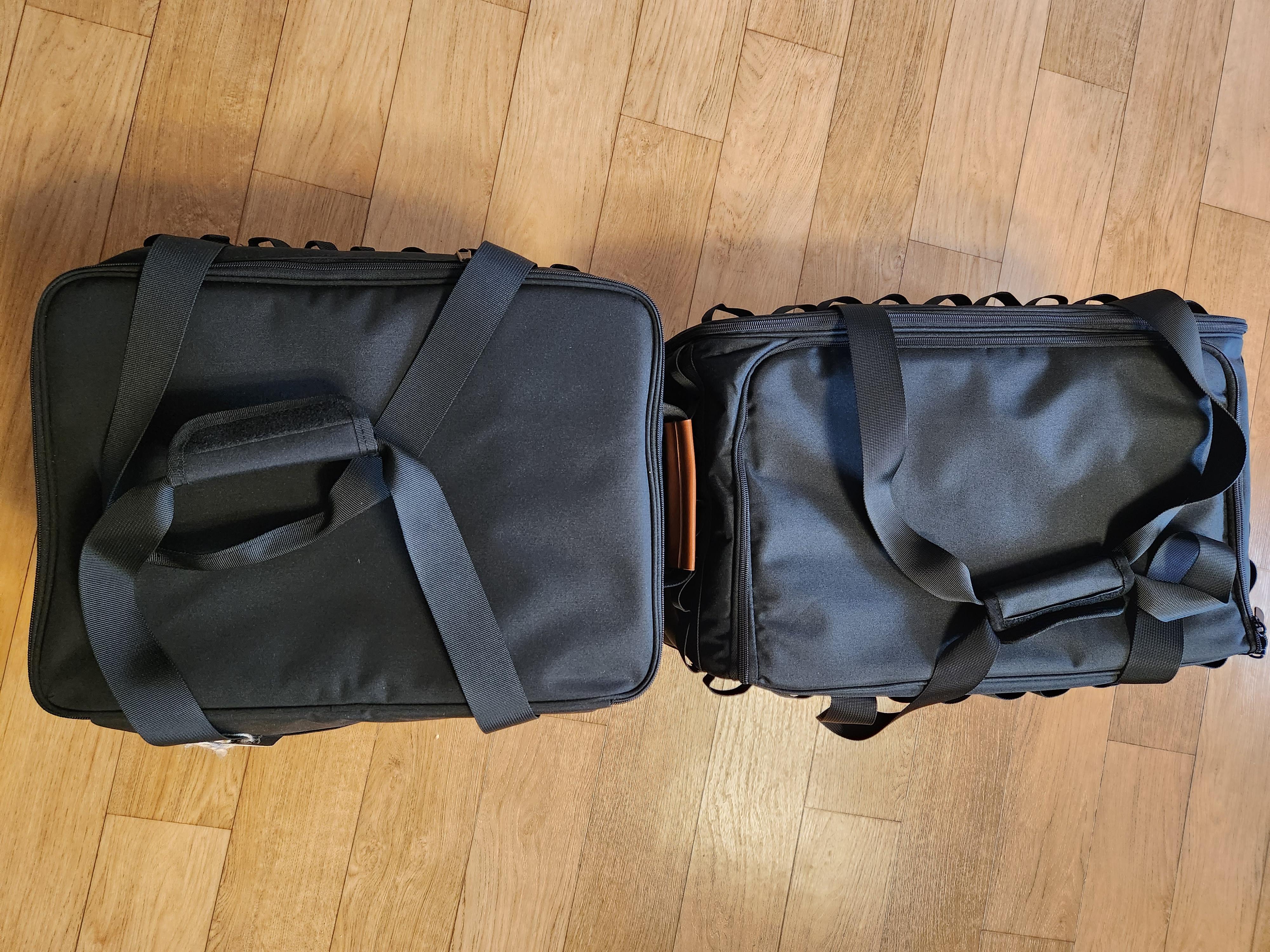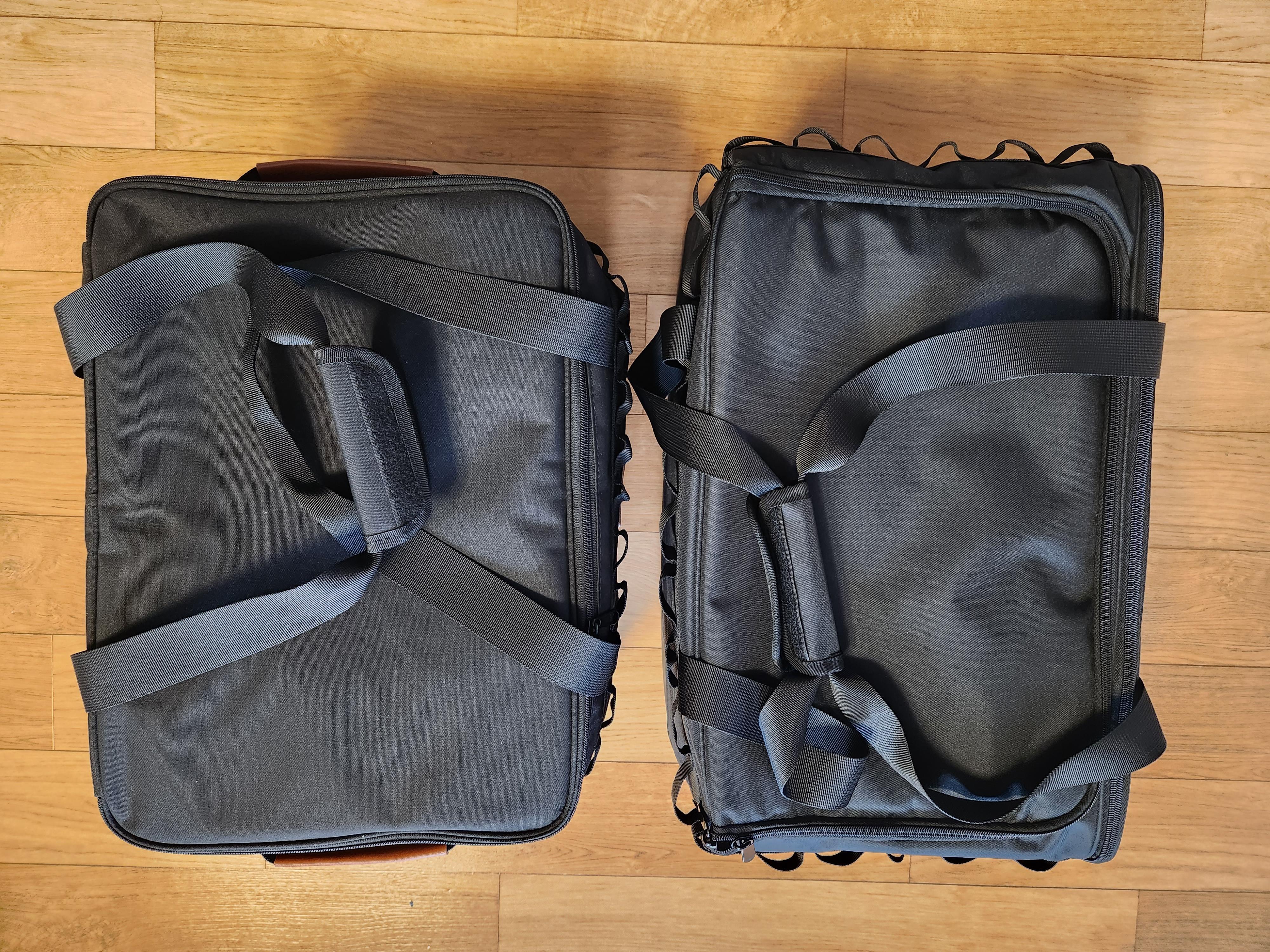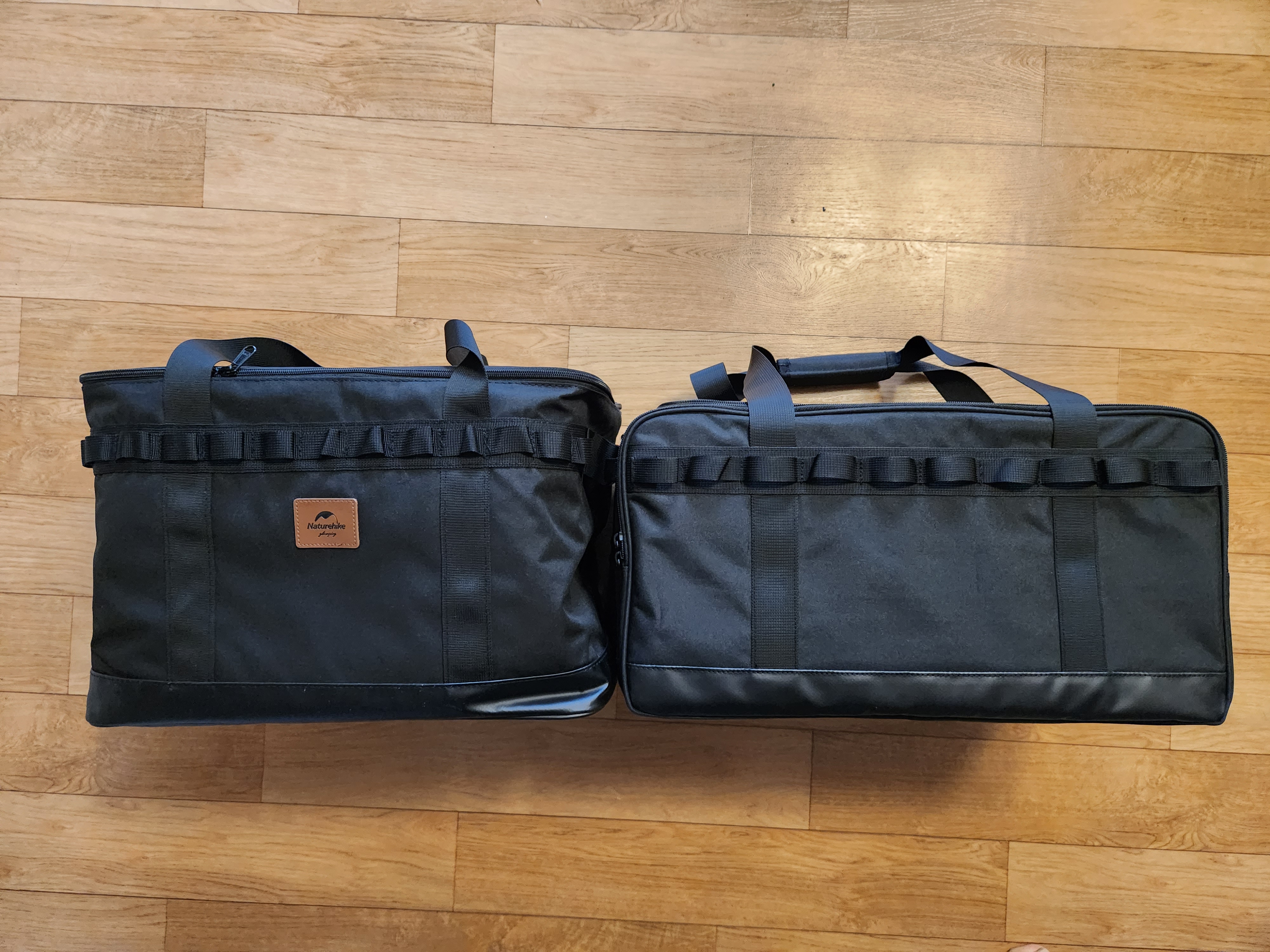 두 가방의 사이즈를 비교해 보겠습니다. 왼쪽은 네이처하이크 캠핑가방 오른쪽은 블랙독 캠핑가방입니다. 가로사이즈는 블랙독 가방이 좀 더 긴 편입니다.