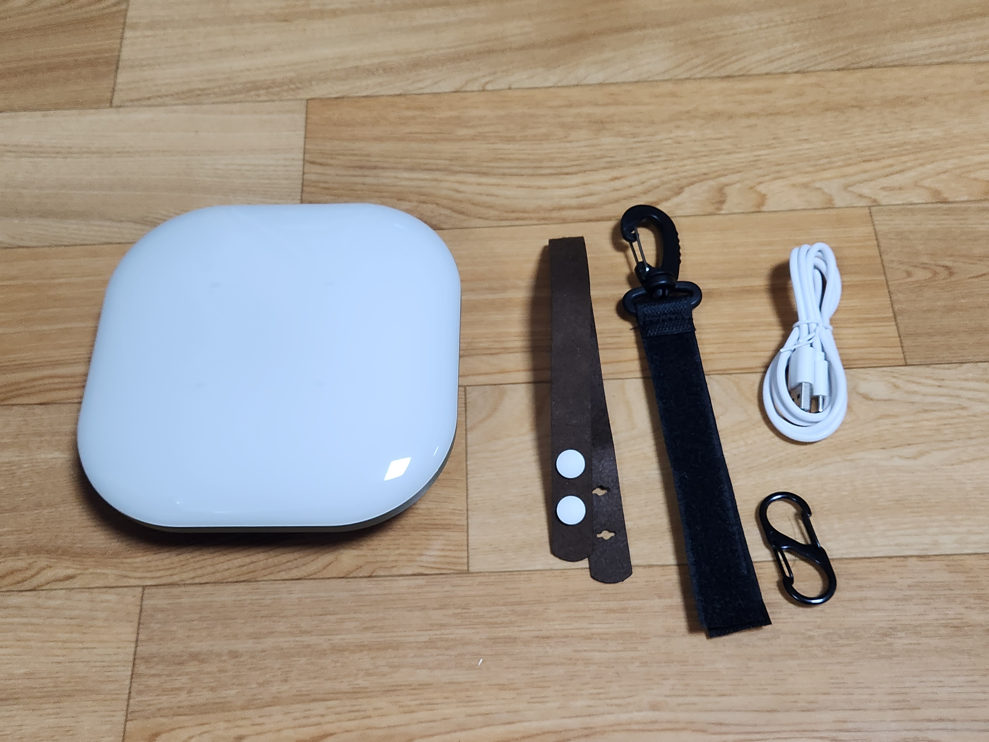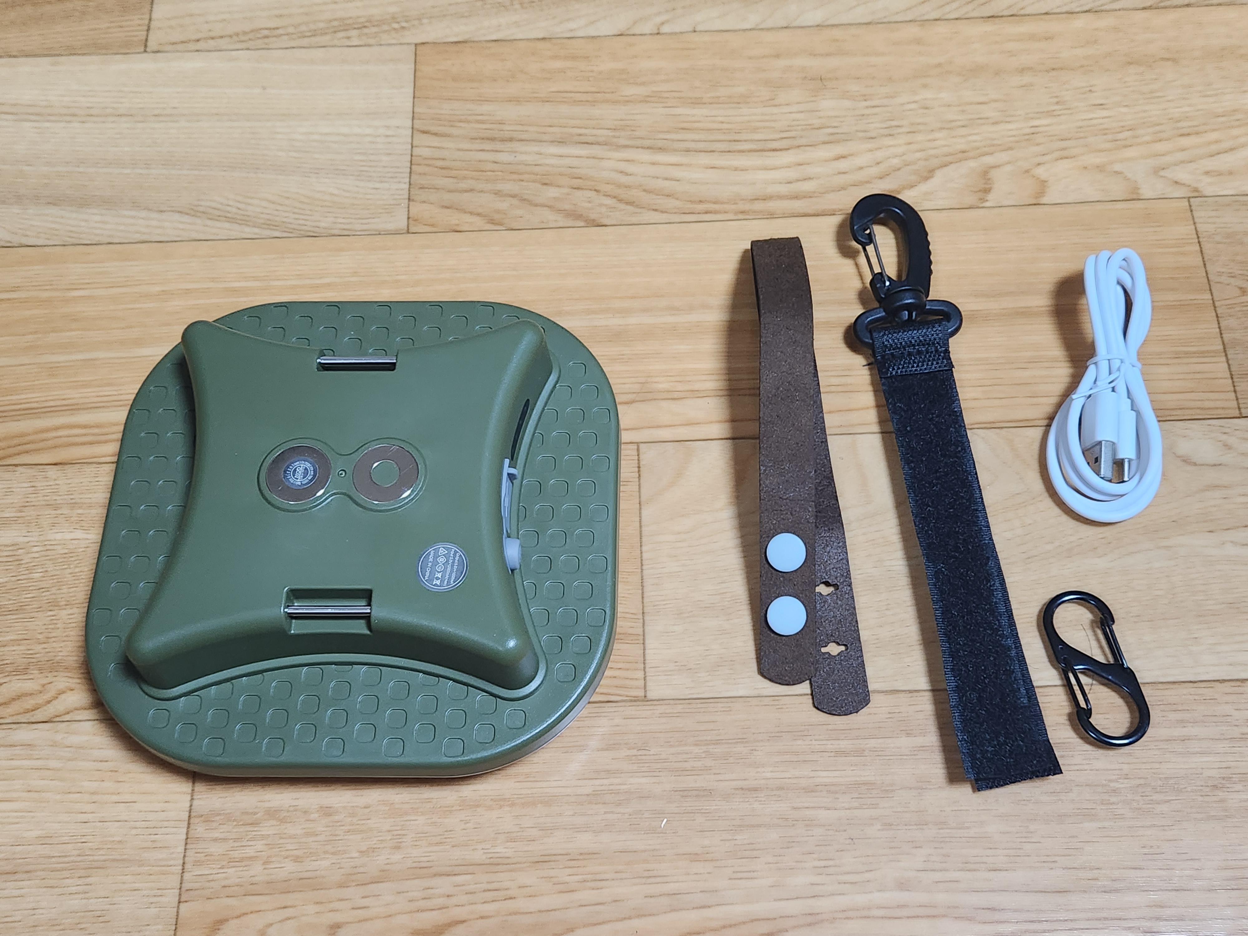 자일리톨 랜턴의 구성품을 살펴보면 렌턴 본체, 걸이형 스트랩, 양방향 비너, 렌턴걸이끈, C타입 충전선이 들어있습니다.