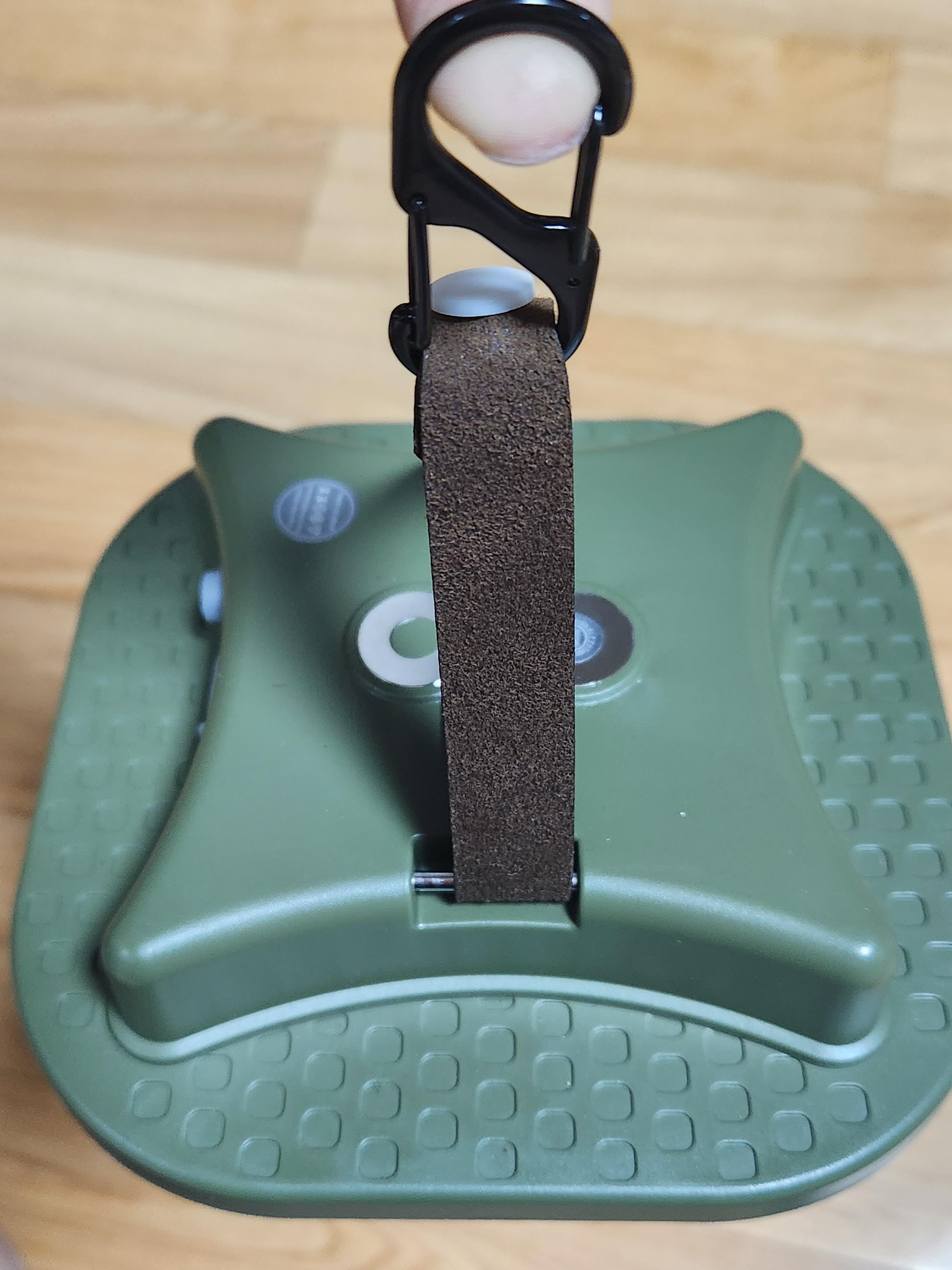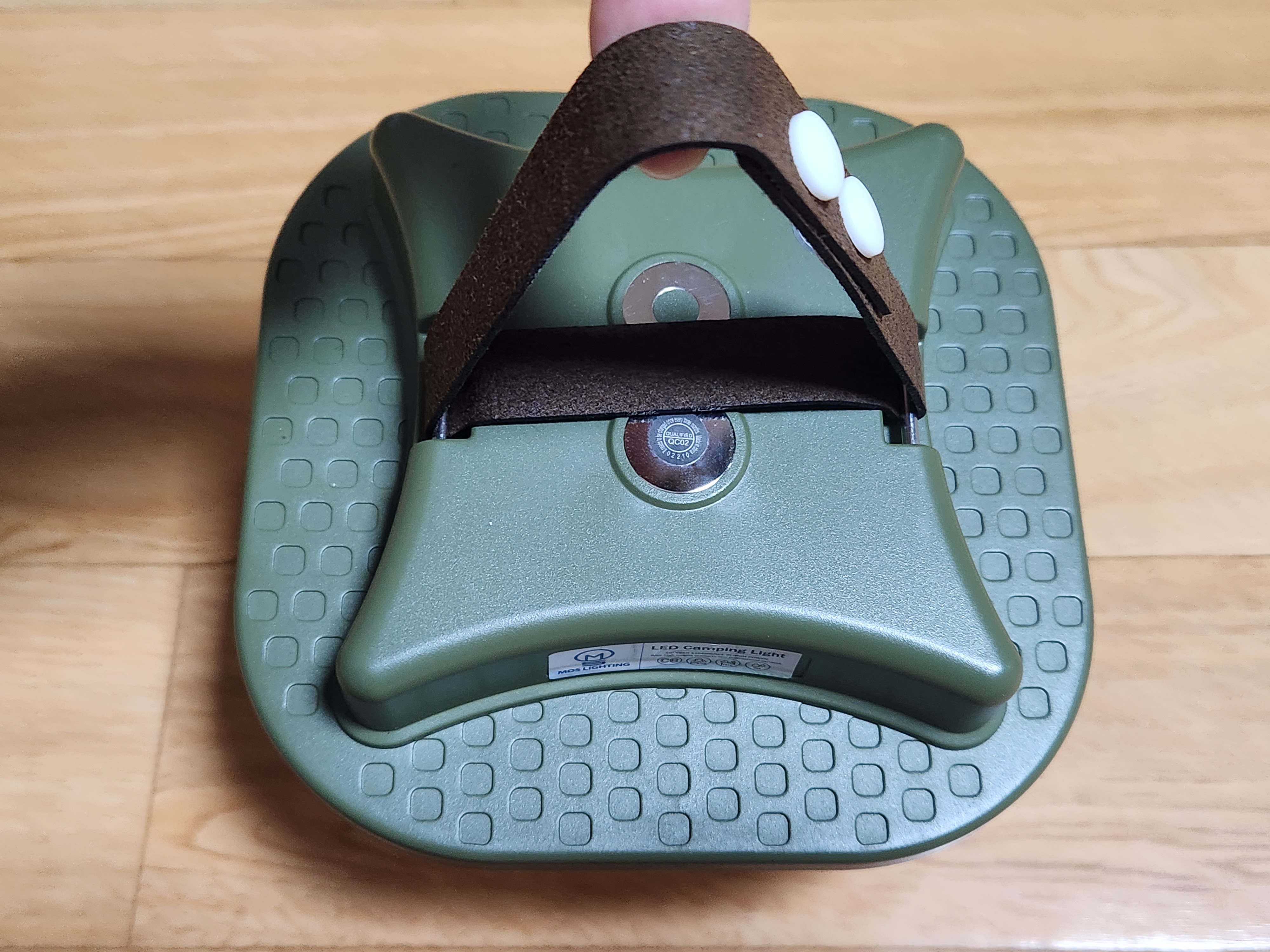 끈을 연결하여 렌턴을 걸어서 쓸 수 있도록 되어 있고 가운데 부분은 강력한 자석이 2개 달려있어서 캠핑용품, 차량 등 주변에 자석이 달라붙을 수 있는 재질이 있다면 부착하여 사용할 수 있습니다.