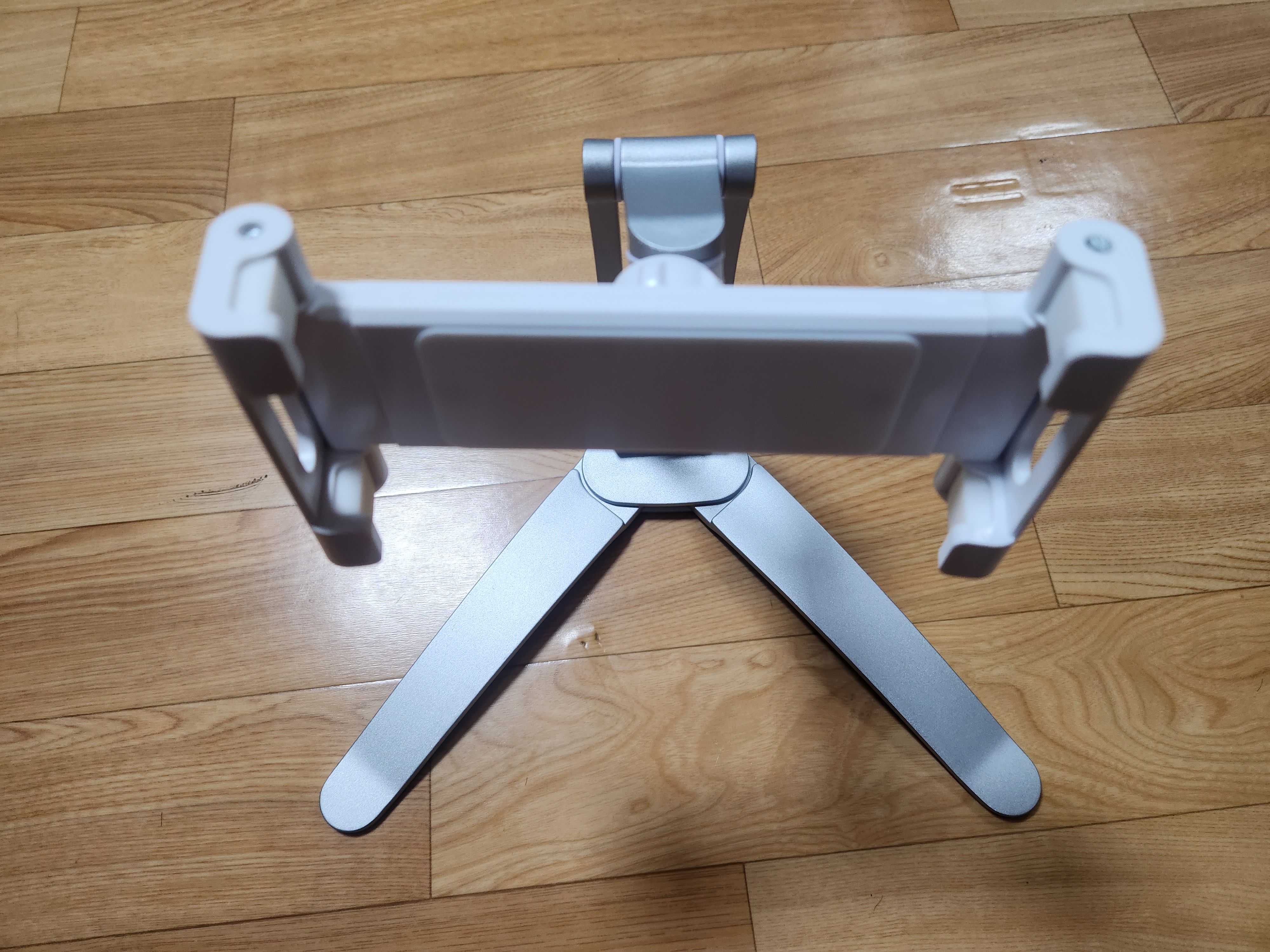 거치대 본체는 다리를 접었다 폈다 할 수 있는 구조로 되어있어 있습니다. 바닥에 거치하고 사용할 경우에 사용하시면 되고 90도 정도 각도가 조정된다고 합니다.