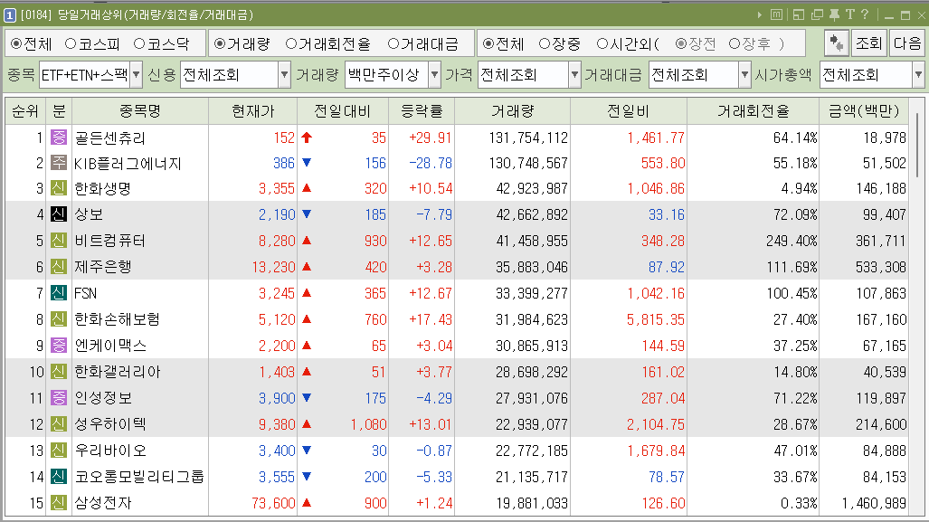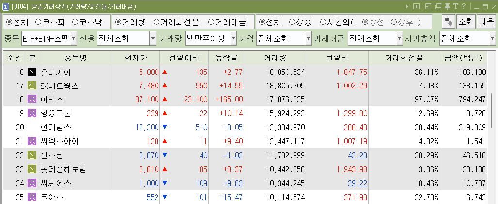 ETF, ETN, 스펙주를 제외한 천만 주 이상 거래종목리스트입니다.