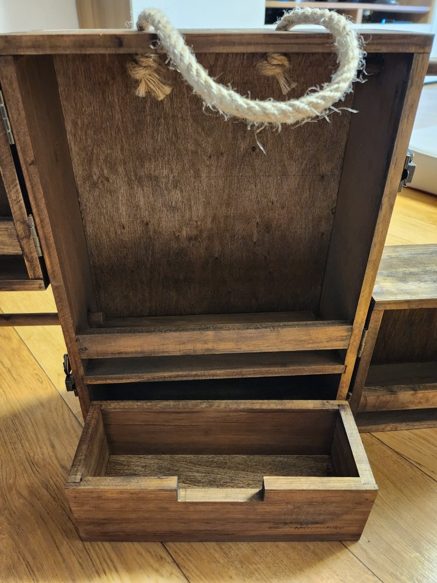 오른쪽 편 캐비닛을 펼쳐 본 모습입니다. 접혀있는 부분을 위로 올려서 원목 스틱을 걸면 고정이 됩니다.