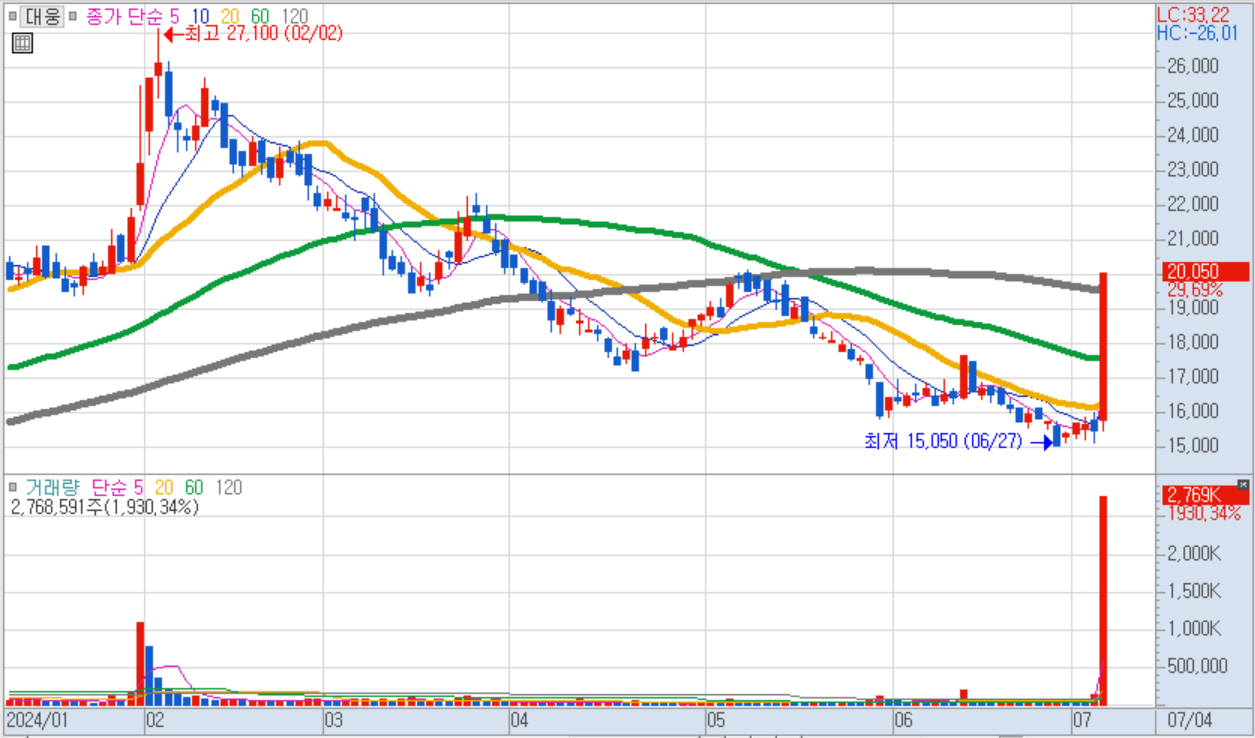 ** 대웅바이오 의약품 위탁생산 서비스(CMO) 사업에 본격적인 참여 소식이 호재로 작용 **
