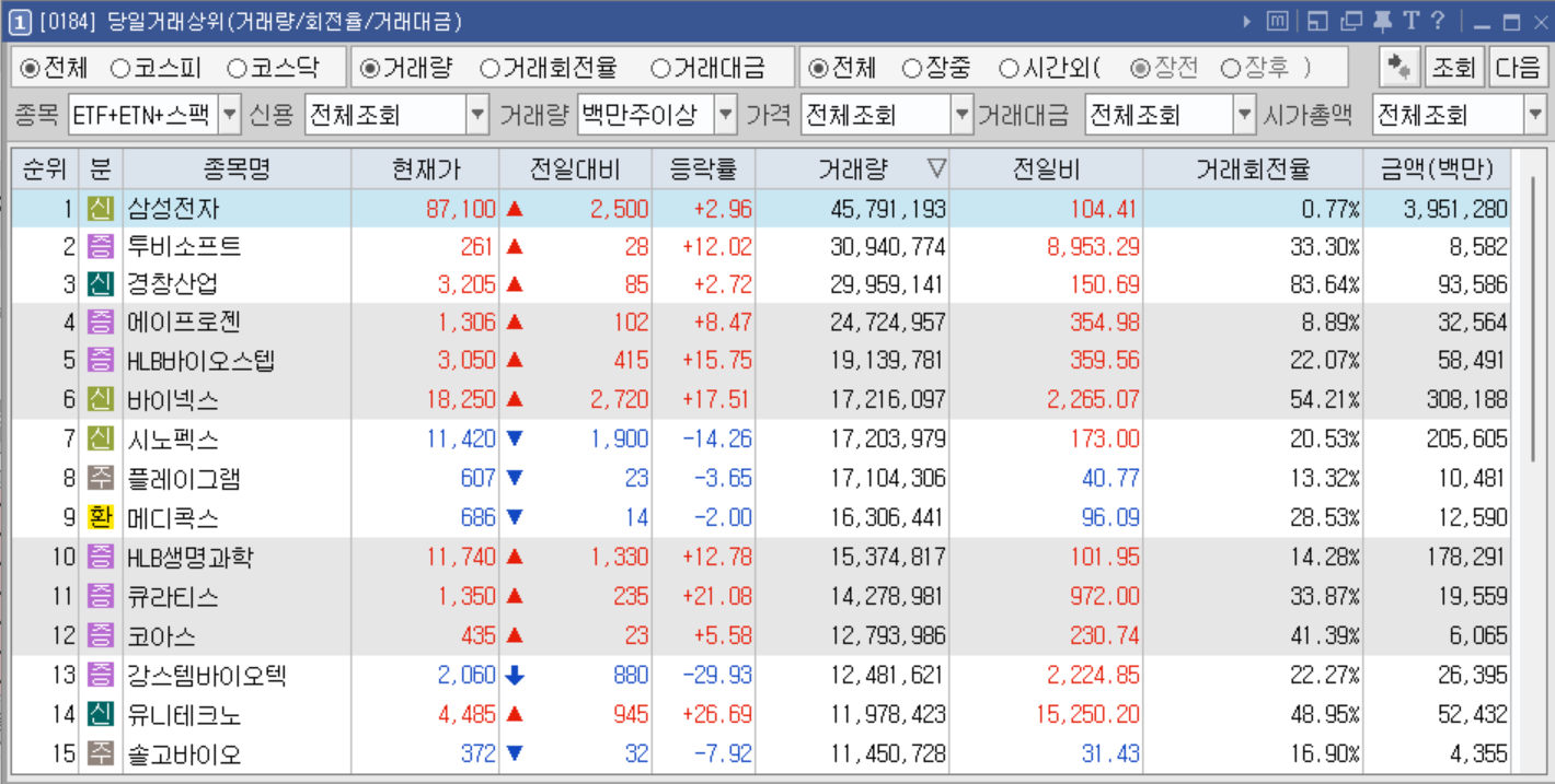 코스피, 코스닥 상한가 종목과 천만 주 이상 거래 종목들을 정리해 보겠습니다.