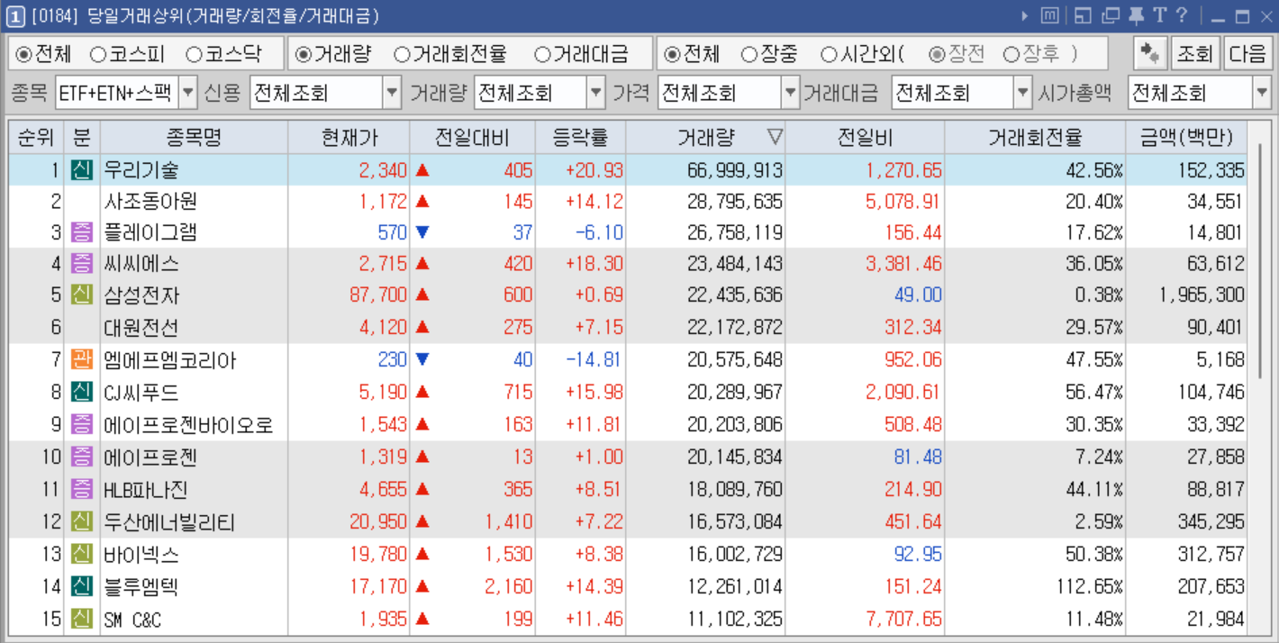 코스피, 코스닥 상한가 종목과 천만 주 이상 거래 종목들을 정리해 보겠습니다.