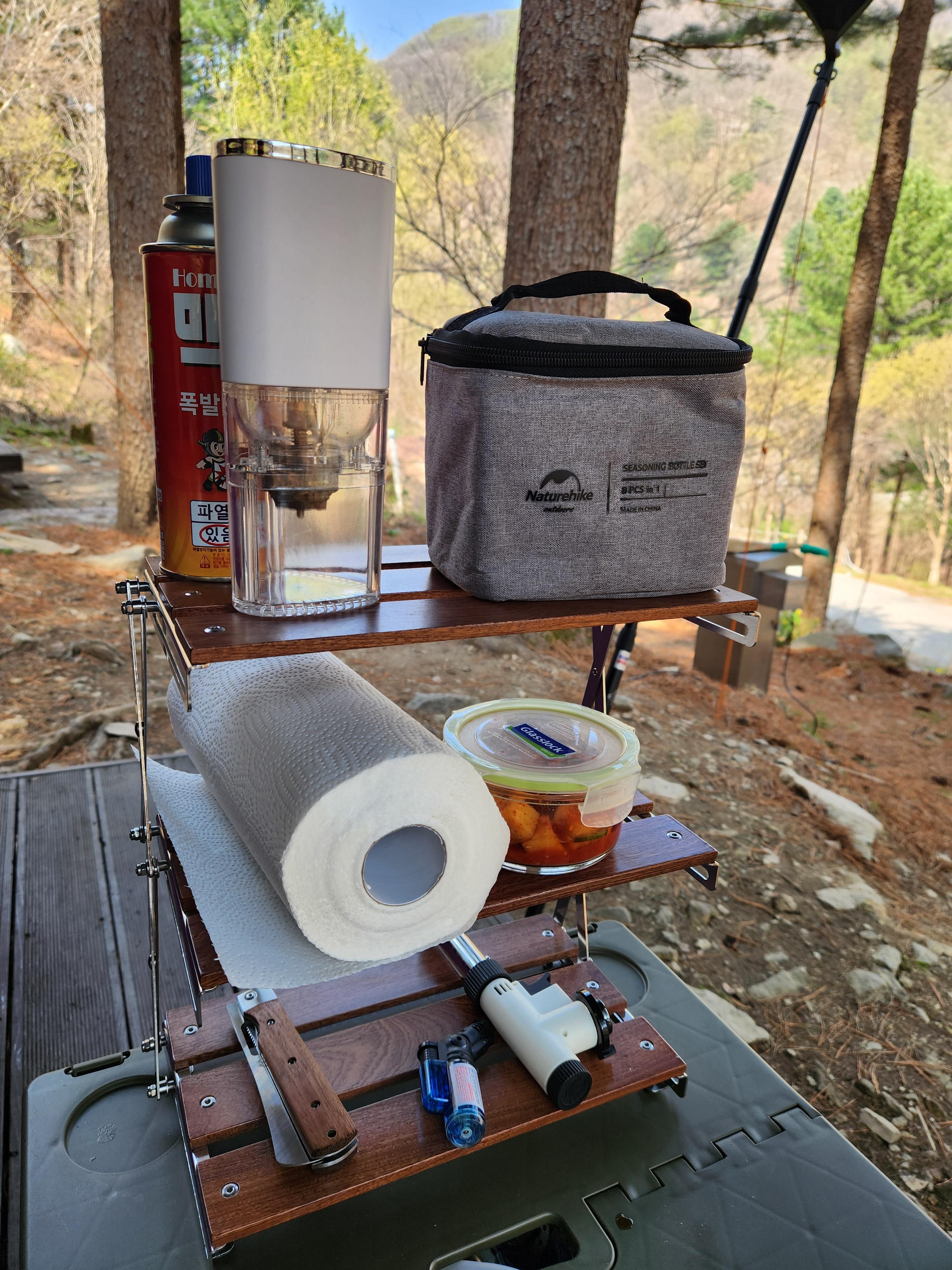 캠핑을 나가서 사용해 본 모습입니다. 이런저런 캠핑용품들을 다양하게 수납할 수 있기 때문에 다용도로 활용이 가능합니다.