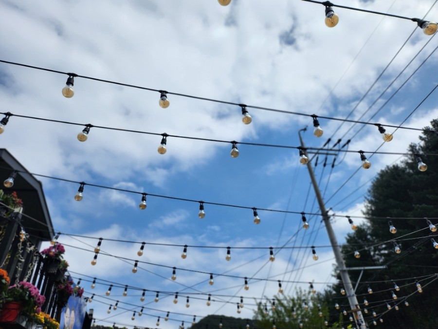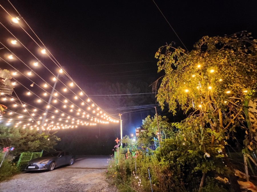 입구 위쪽에는 주렁주렁 전구들을 많이 달아 놓으셨고 캠핑장 전체에 전구들을 많이 달아 놓으셨습니다.