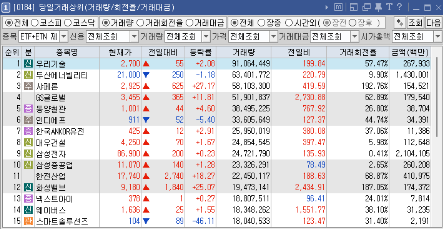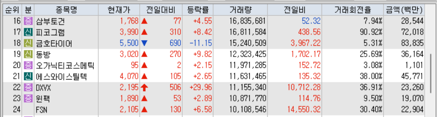 금일 천만 주 이상 거래 종목은 ETF, ETN, 스펙주를 제외하고 24개 종목이었습니다.