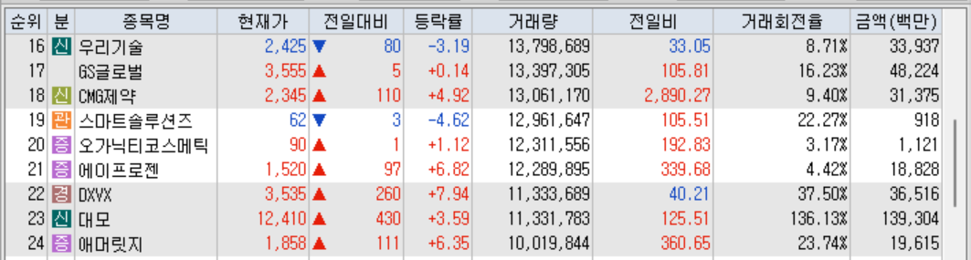 금일 천만 주 이상 거래 종목은 ETF, ETN, 스펙주를 제외하고 24개 종목이었습니다.