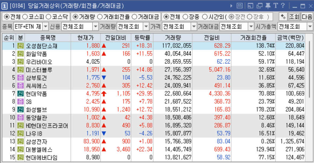 금일 천만 주 이상 거래 종목은 ETF, ETN, 스펙주를 제외하고 24개 종목이었습니다.