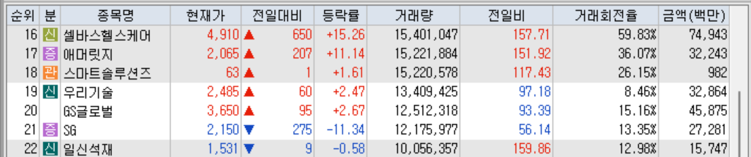 코스피, 코스닥 상한가 종목과 천만 주 이상 거래 종목들을 정리해 보겠습니다.