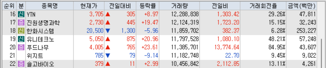 금일 천만 주 이상 거래 종목은 ETF, ETN, 스펙주를 제외하고 22개 종목이었습니다.