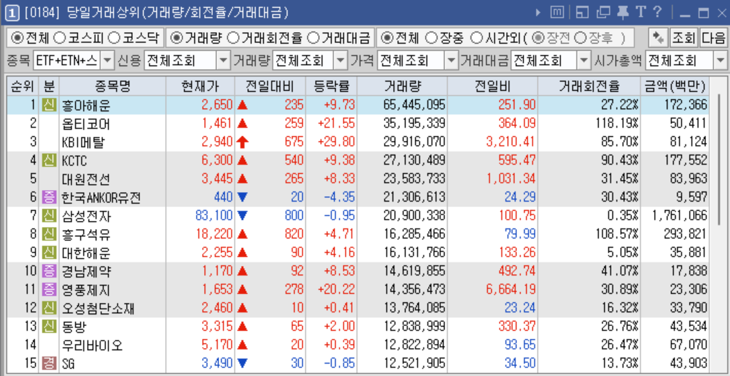금일 천만 주 이상 거래 종목은 ETF, ETN, 스펙주를 제외하고 20개 종목이었습니다.
