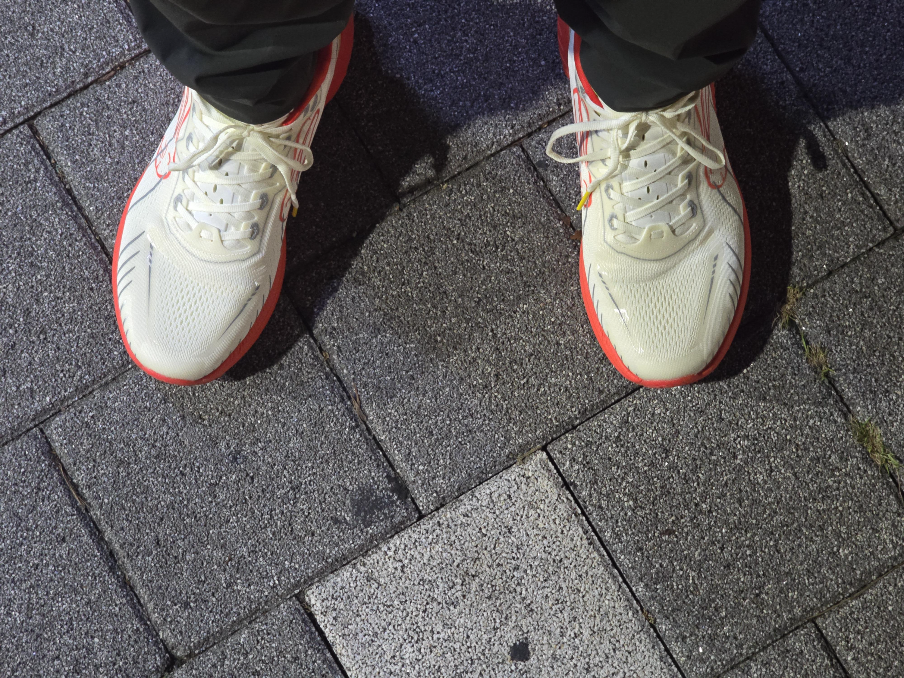 5.5km 정도 러닝 후 찍어본 사진입니다. 디자인과 색상은 중국 제품처럼 보이고 어퍼는 아리보리 색상으로 무난합니다.