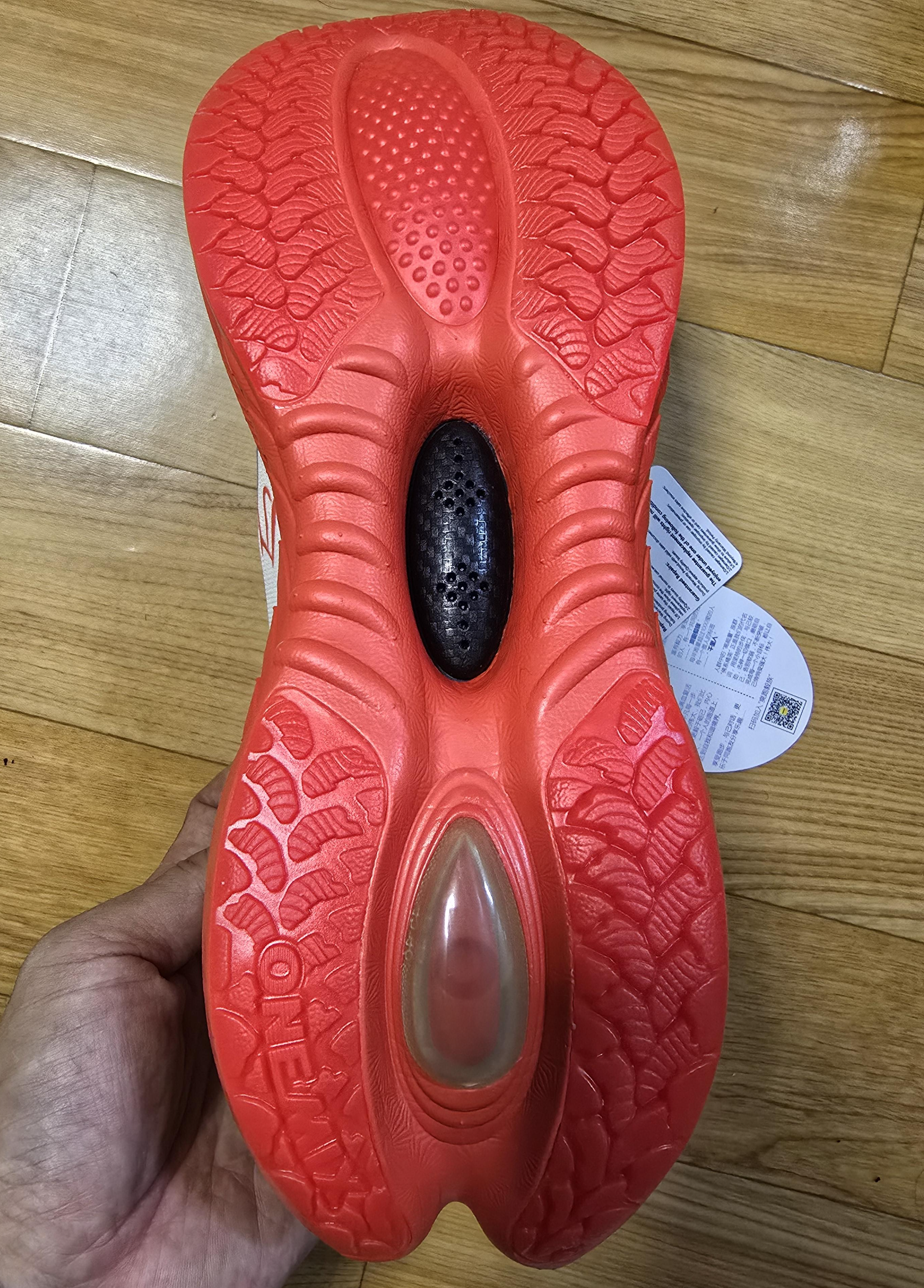 신발 바닥 모습입니다. 아웃솔은 튼튼해 보였고 중앙에 아치형 카본 플레이트 뒤쪽은 에어가 들어가 있는 모습입니다.