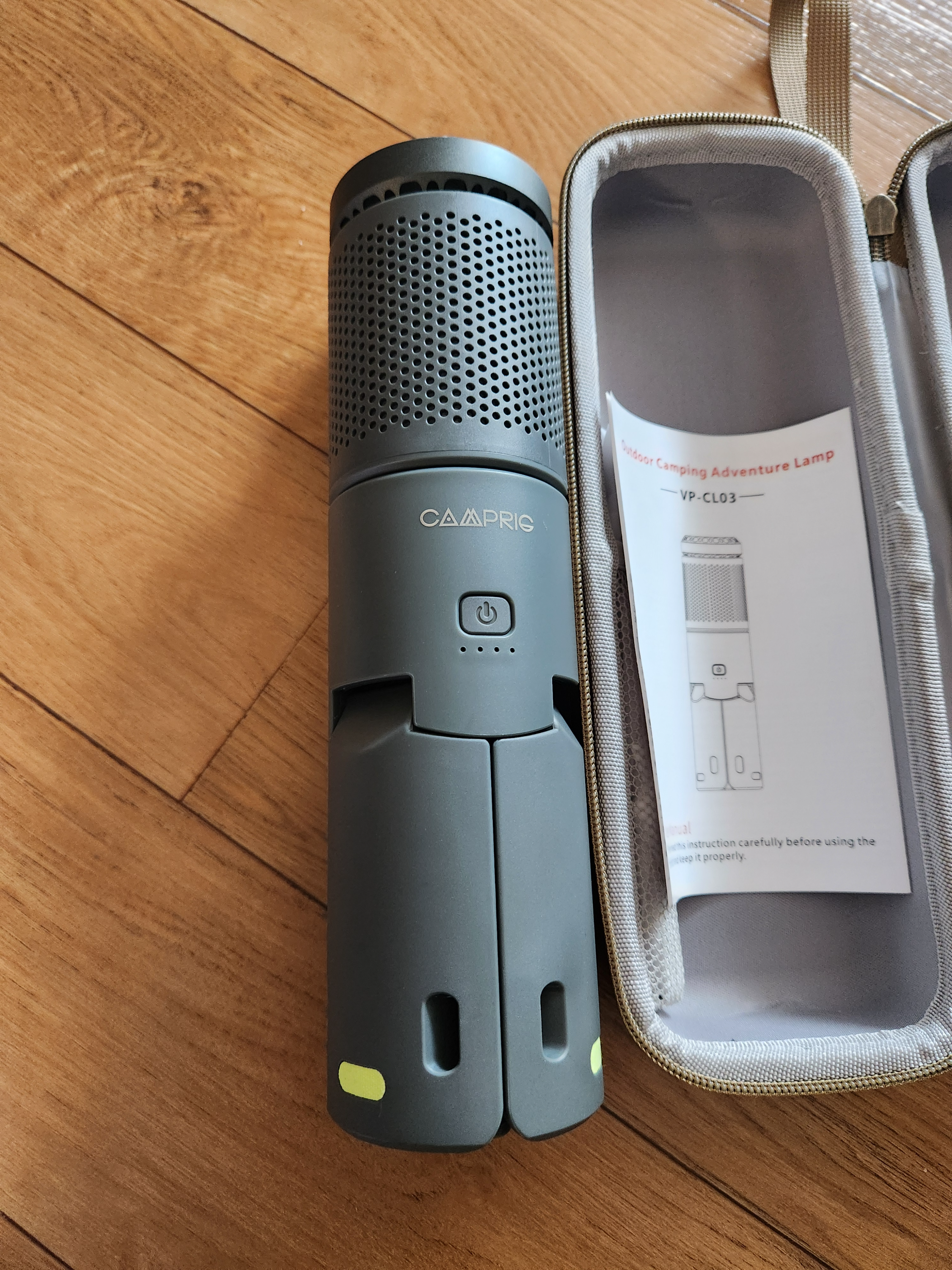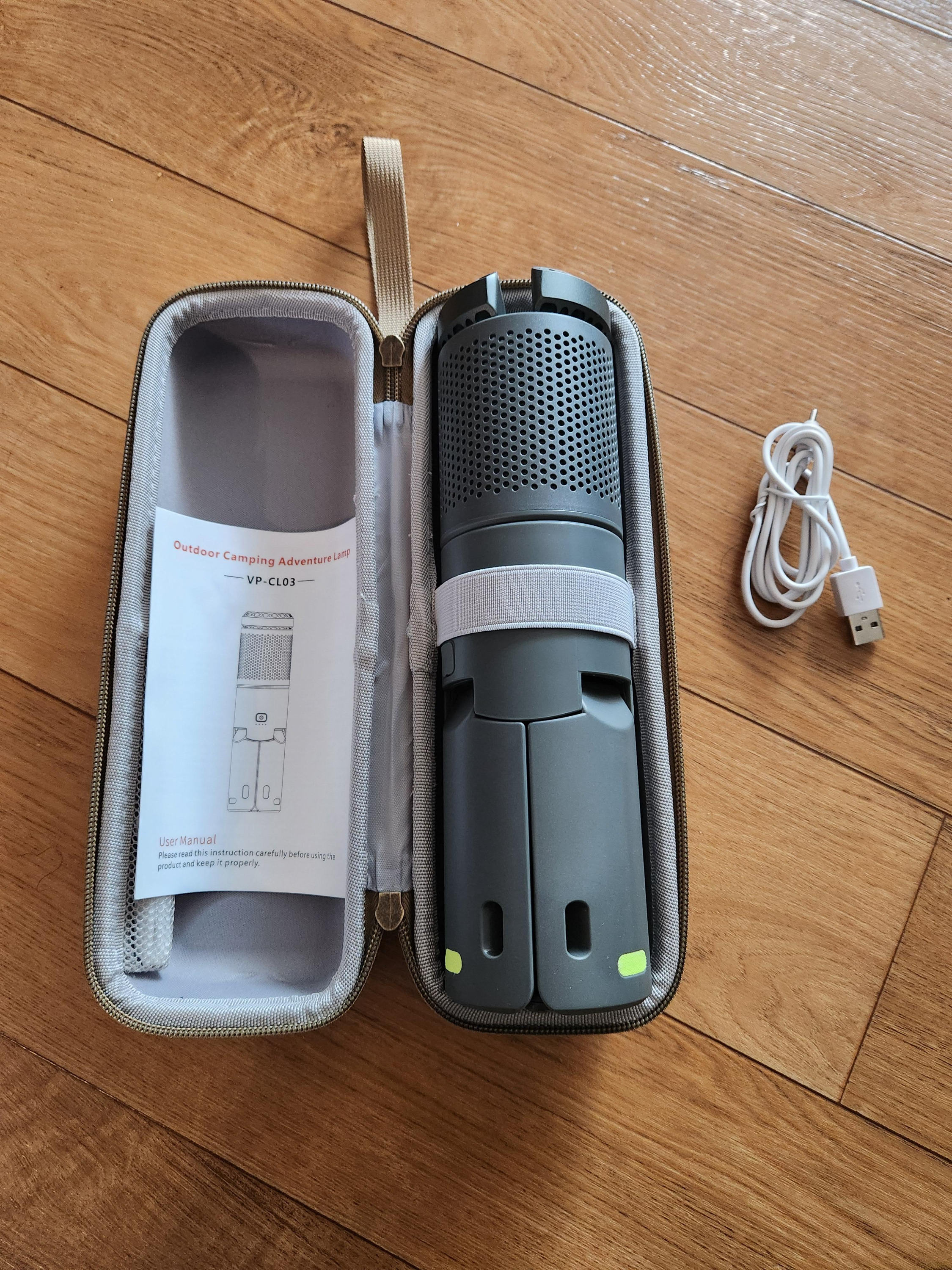 케이스를 열어 구성품을 살펴보면 케이스, 랜턴, 충전선으로 구성되어 있습니다.