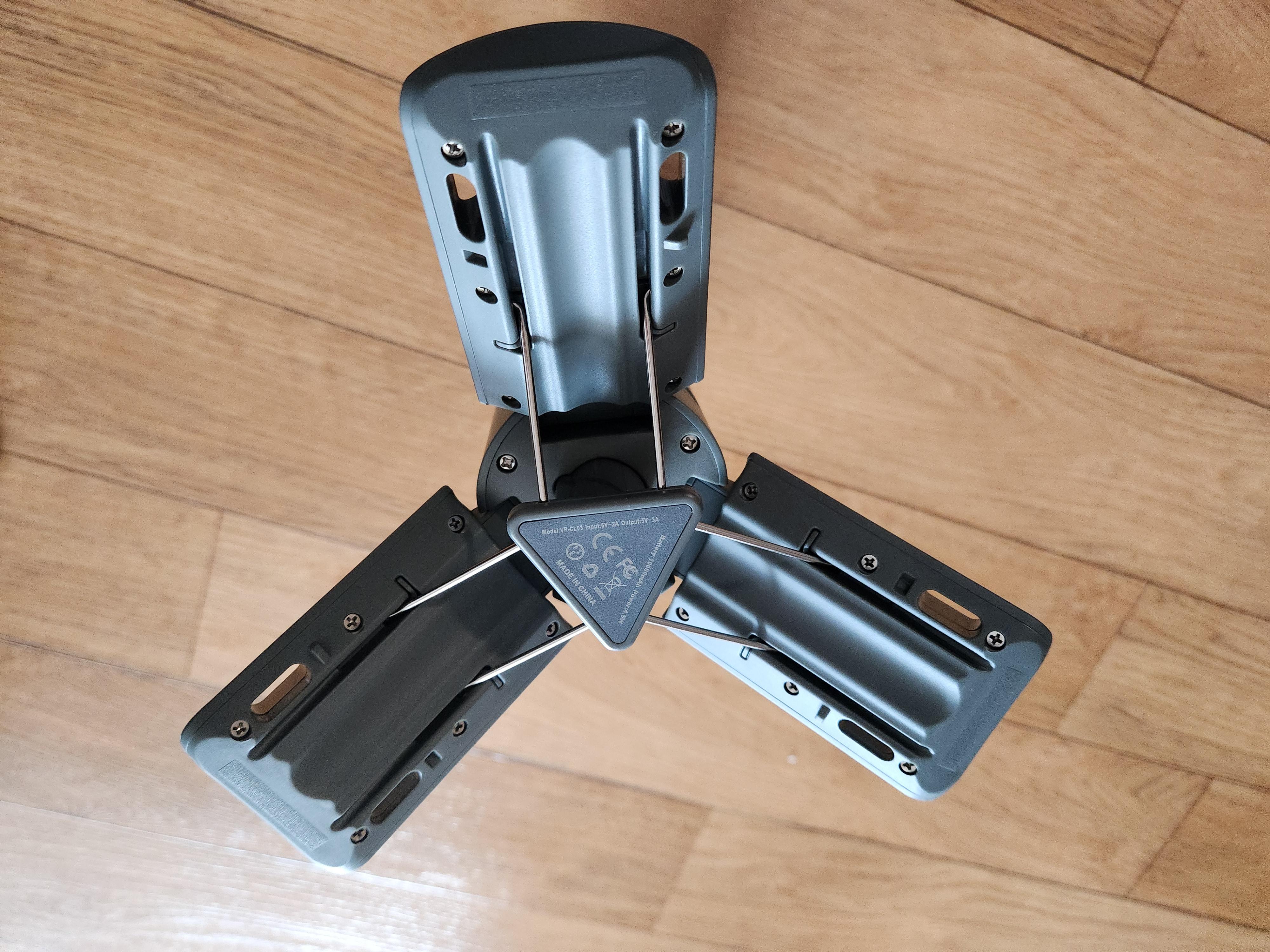 다리를 옆으로 펼치면 펴지면서 삼각대 구조가 되는 형태입니다. 펼쳐진 다리 부분에는 자석이 있어 철로 된 재질의 물건에 붙여서 사용도 가능합니다. 야외에서는 자동차에서 붙여서 사용하기 편리할 것입니다.
