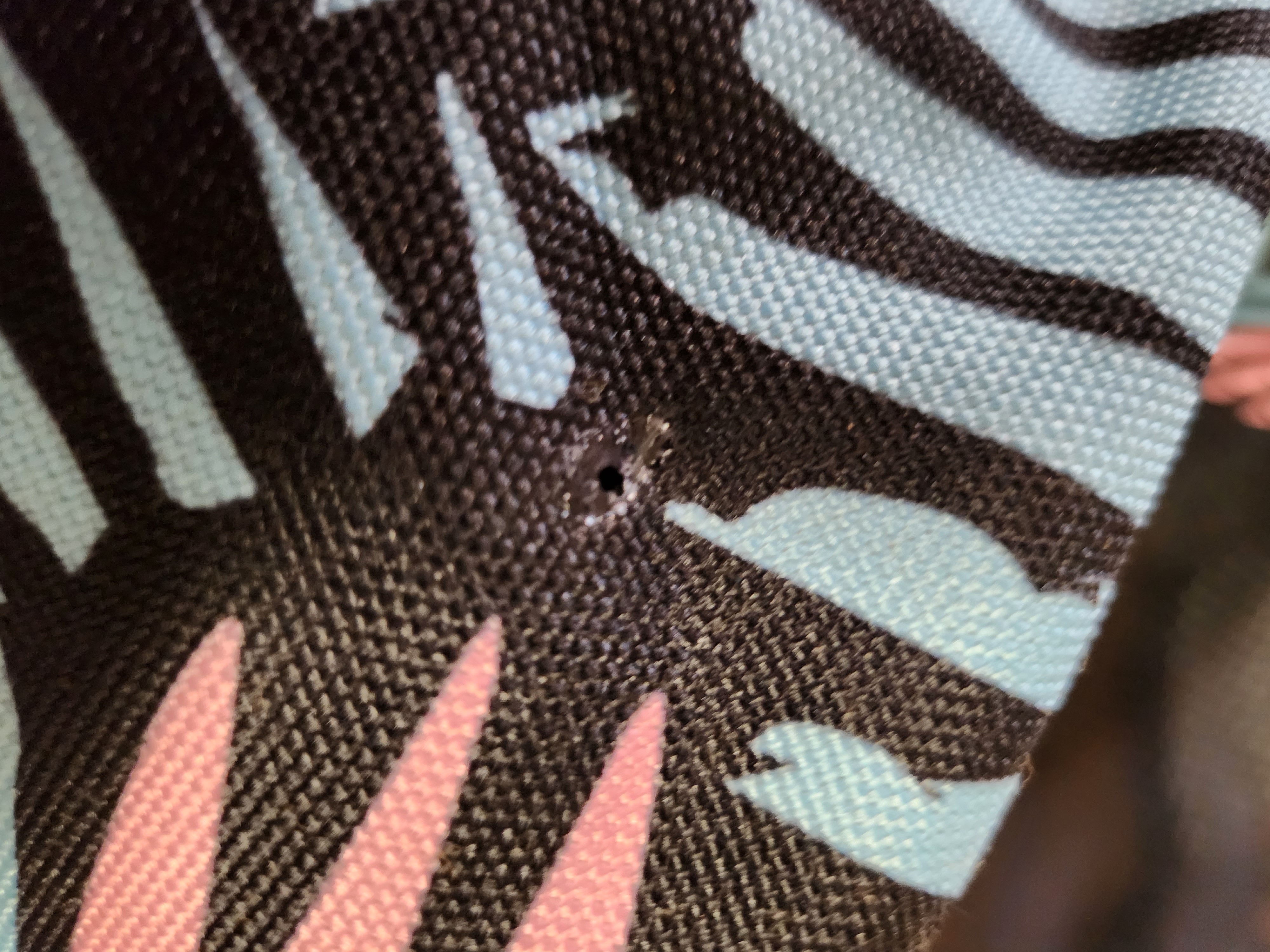얼마 전 캠핑을 갔다가 잘 타고 있던 장작에서 불똥이 튀어 의자에 구멍이 두 개나 생겨버렸네요.