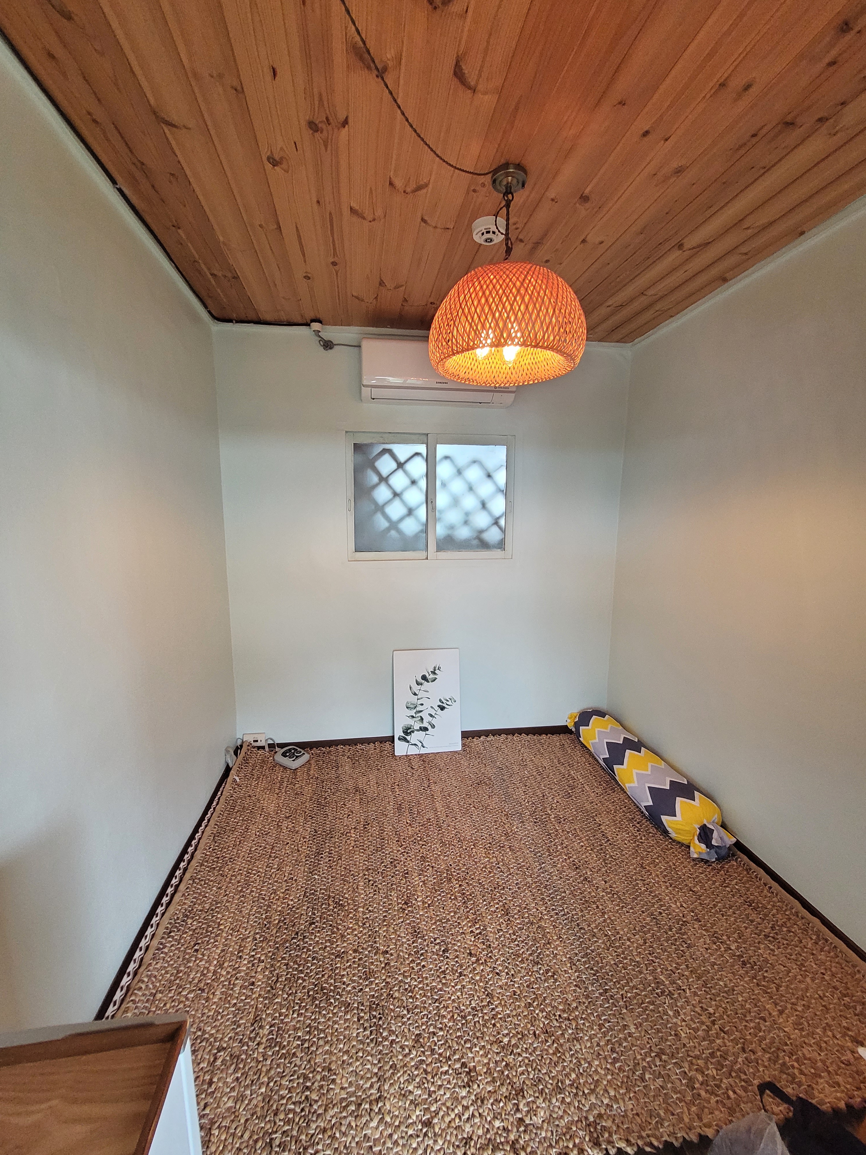 작은방은 에어컨, 옷걸이, 침구류 정도만 구비되어 있고 2~3인 정도 사용할 수 있는 크기입니다.