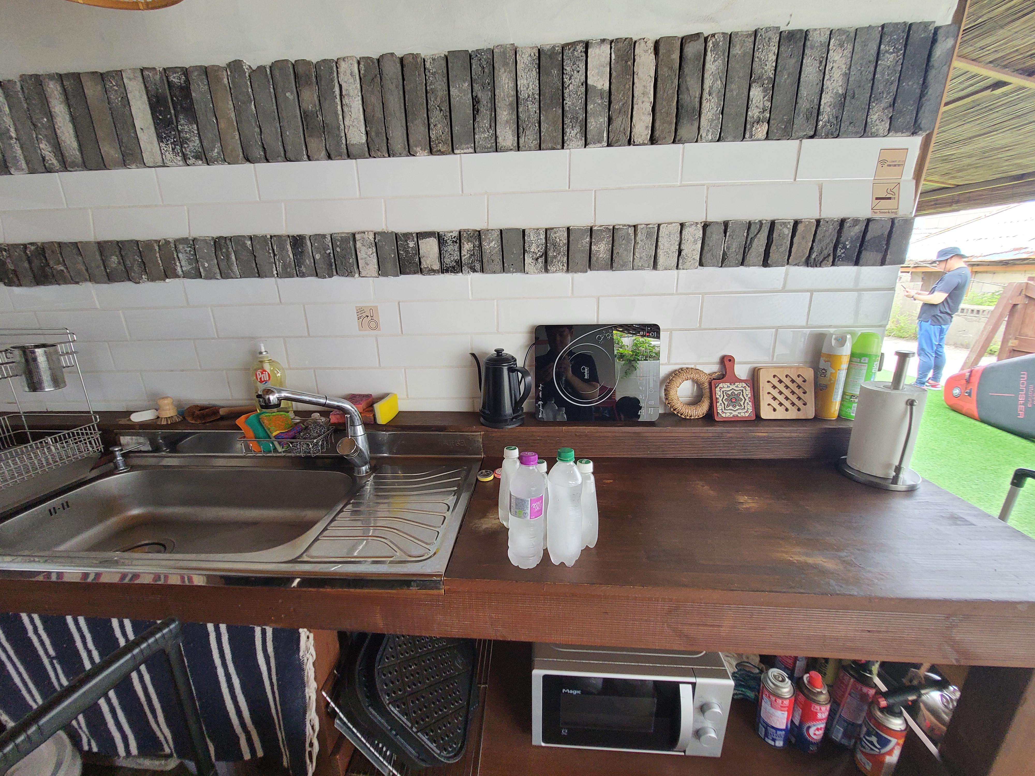 부엌 바로 앞쪽에는 캠핑용 테이블과 의자가 준비되어 있어 옹기종기 모여 앉아 캠핑하는 기분을 낼 수 있습니다.