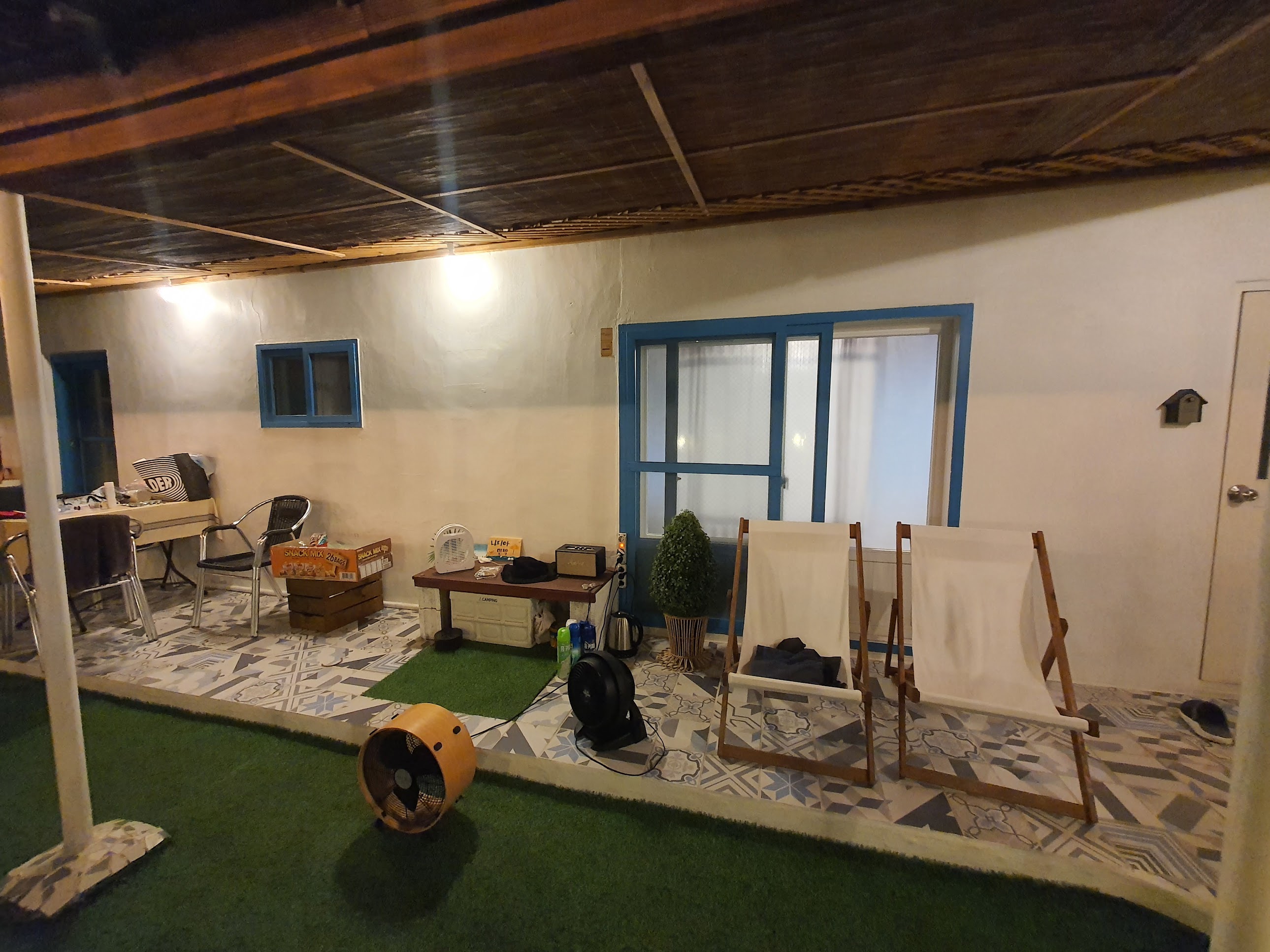 마당에는 의자, 선풍기, 서큘레이터, 모기향, 블루투스 스피커 등 다양한 편의 장비들이 준비되어 있습니다.