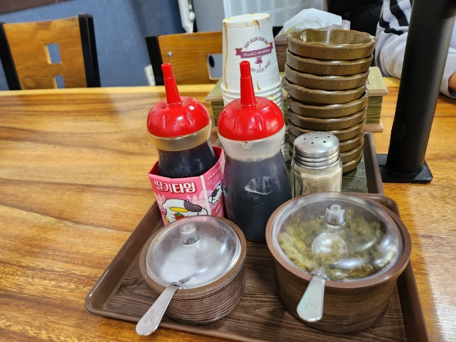 고추 절임, 간장 소스, 고추기름, 소금, 후춧가루가 준비되어 있습니다.