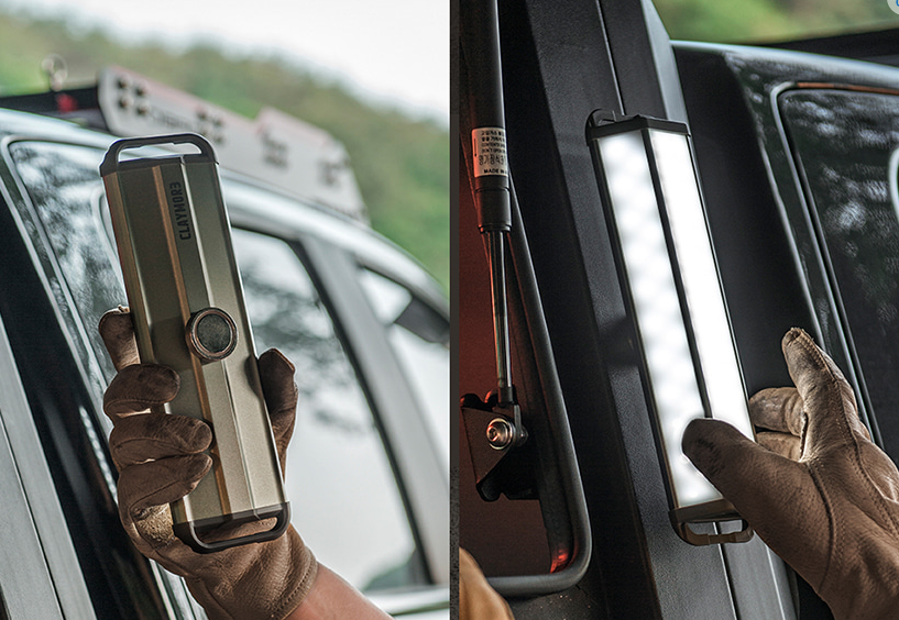 렌턴 본체의 뒷면 중앙소켓은 자석(네오디움 마그네틱)을 연결한 후 자석(네오디움 마그네틱)이 붙을 수 있는 곳에 부착하여 사용이 가능하다고 설명되어 있습니다.