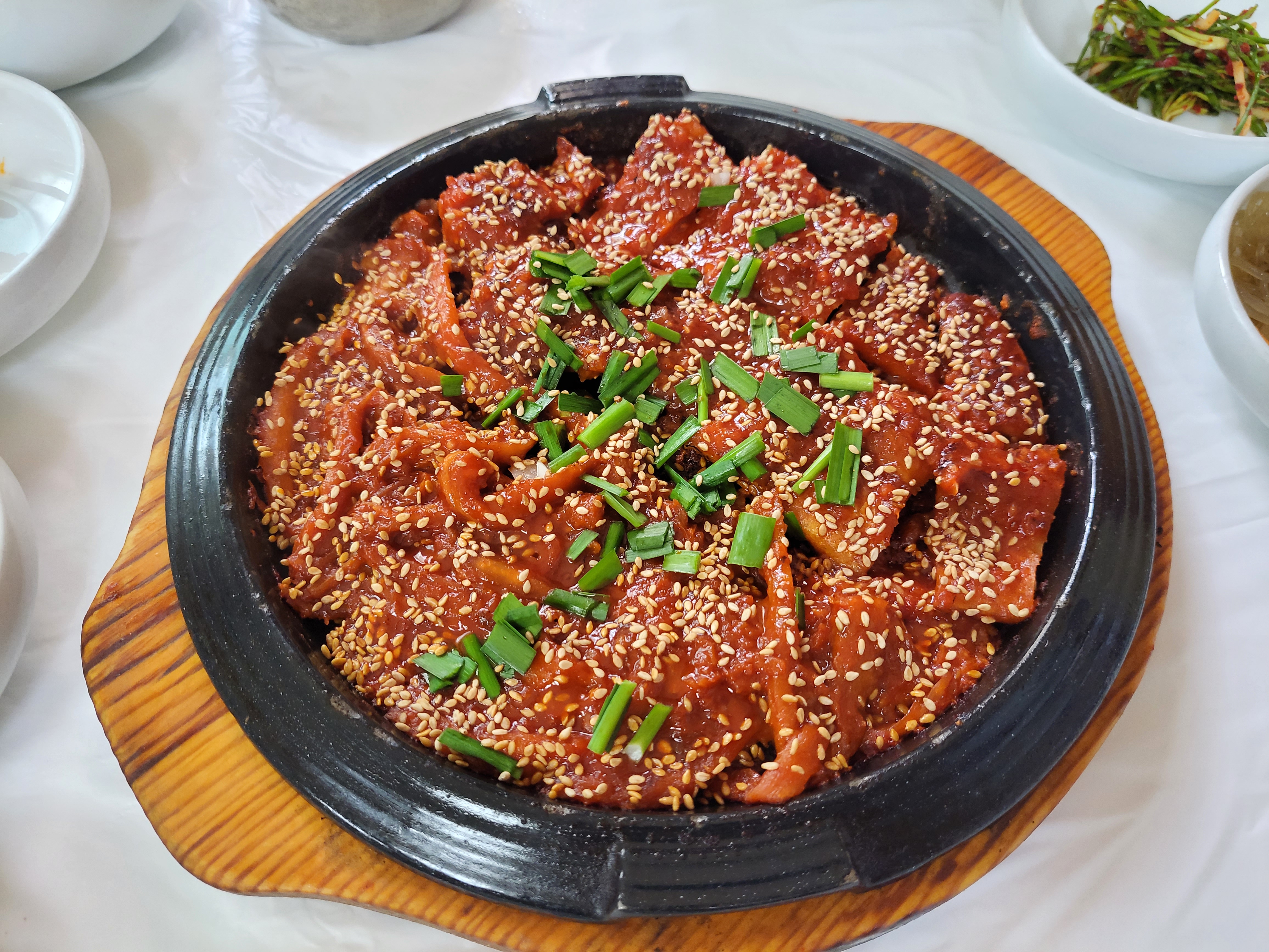 동그란 철판위에 반반씩 나눠 주시네요. 자세히 보면 황태 반, 더덕 반입니다.