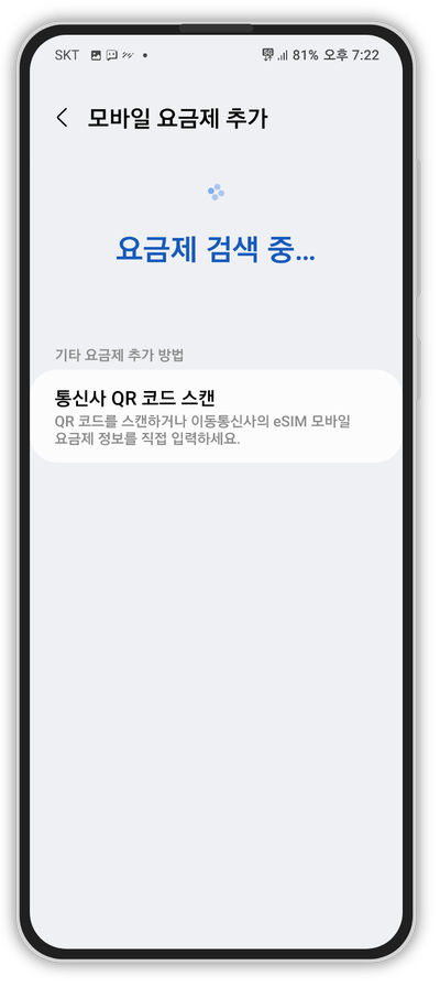 - 설정 > 연결 > SIM 카드 관리자 > 모바일 요금제 추가 > 통신사 QR 코드 스캔