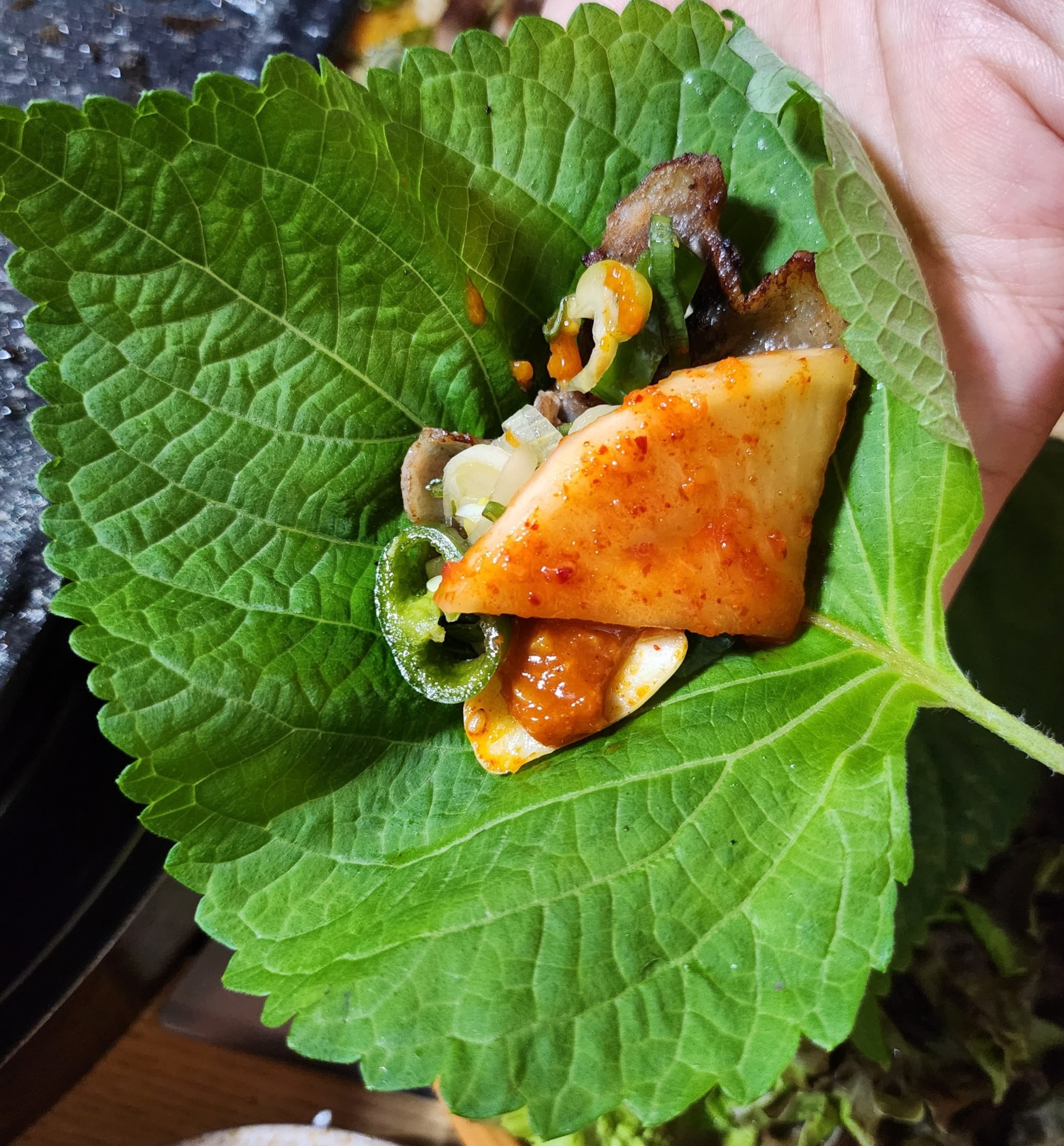 지글지글 구운 대패 삼겹살을 깻잎에 싸서 쌈장과 마늘, 청양고추 등을 추가해 먹으니 대박 꿀맛입니다.