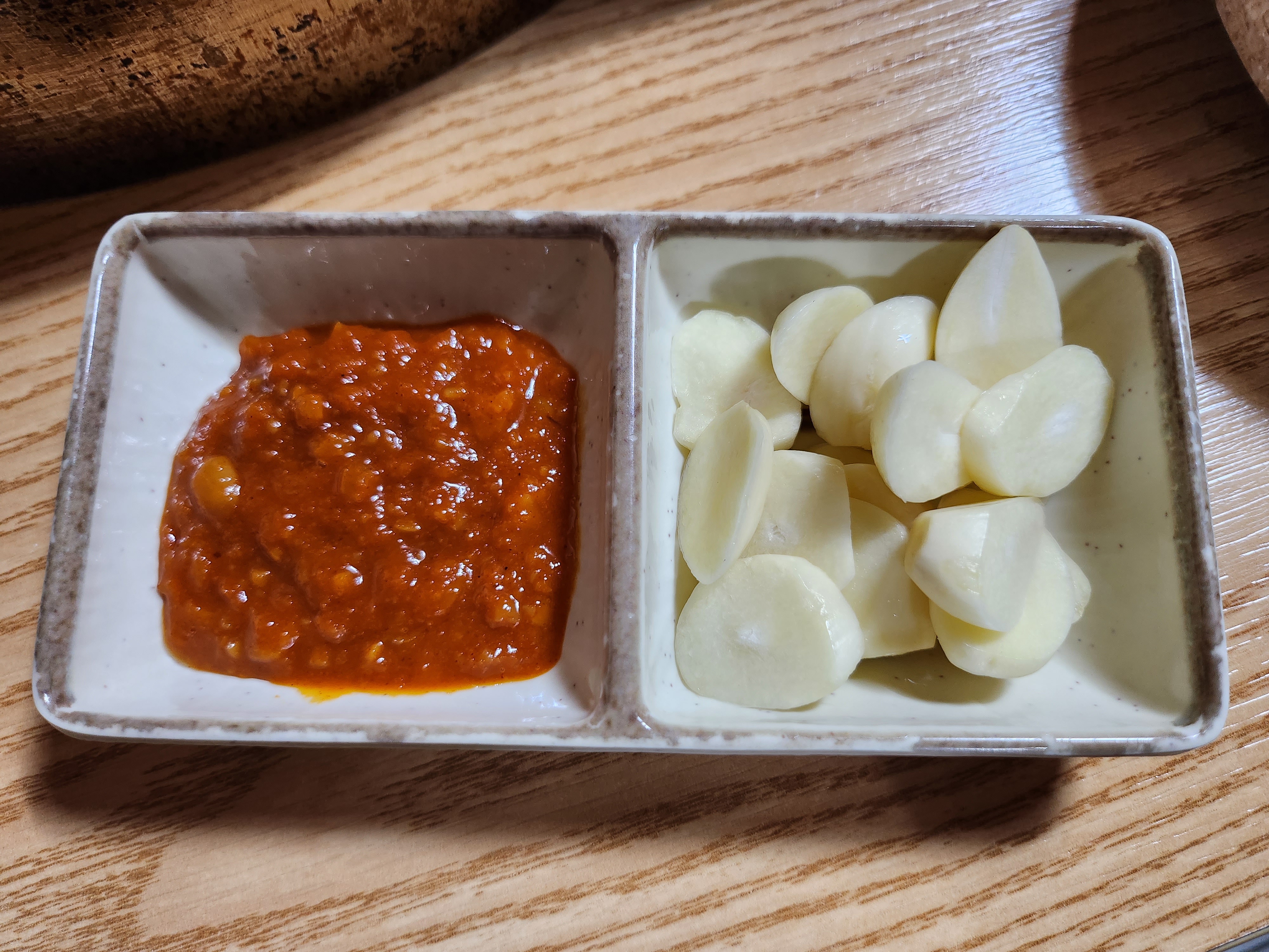 고깃집에 가면 기본 구성으로 나오는 마늘과 쌈장입니다. 우리가 아는 아주 흔한 그 맛이죠?