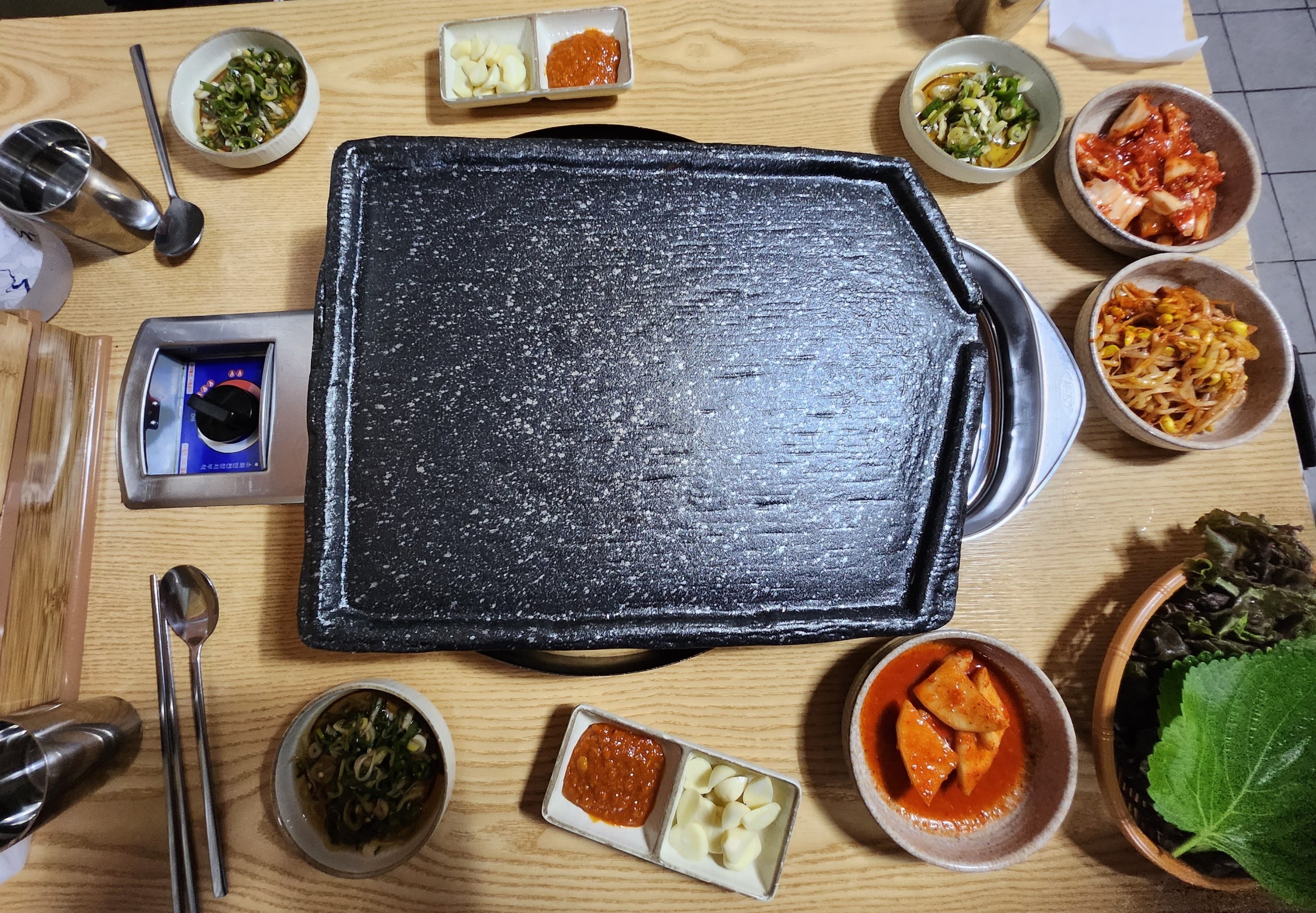 기본 불판은 코팅되어있고 약간 기울어져 있어 기름이 밑으로 흘러내려 김치와 콩나물 등을 구워서 먹기 좋은 구조입니다.