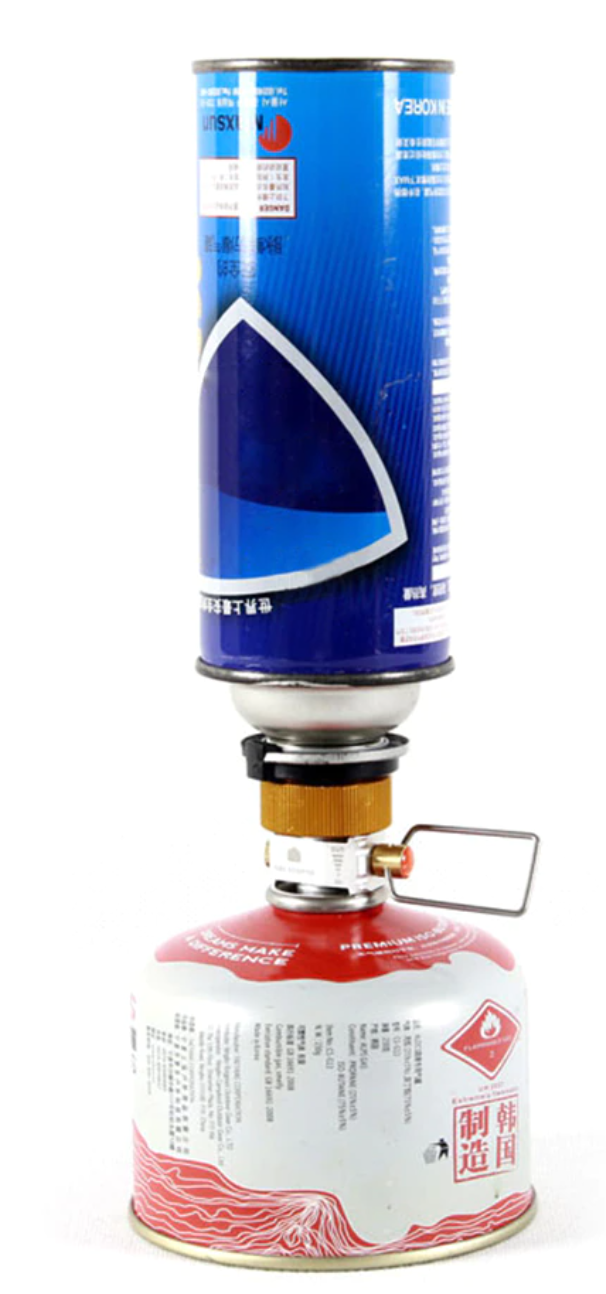 가스세이버 상부에는 잔량이 남은 가스통을 연결하고 하부 쪽에는 가스를 저장할 대상의 가스통을 체결하여 가스를 이동시켜주는 역할을 합니다. 부탄과 이소 모두 서로 옮겨서 사용할 수 있습니다.