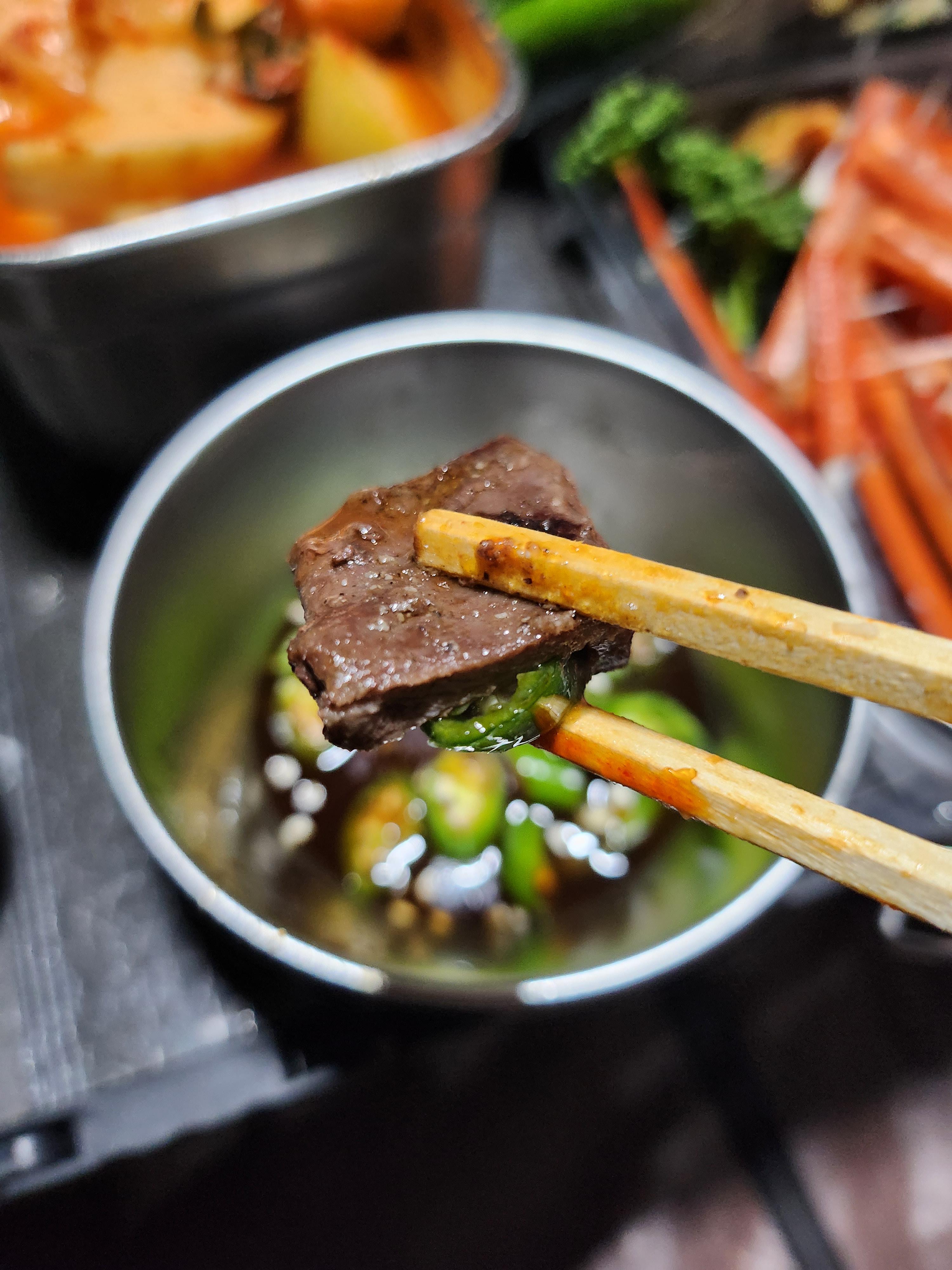 염통에 청양고추와 소스를 찍어 함께 먹어봅니다.