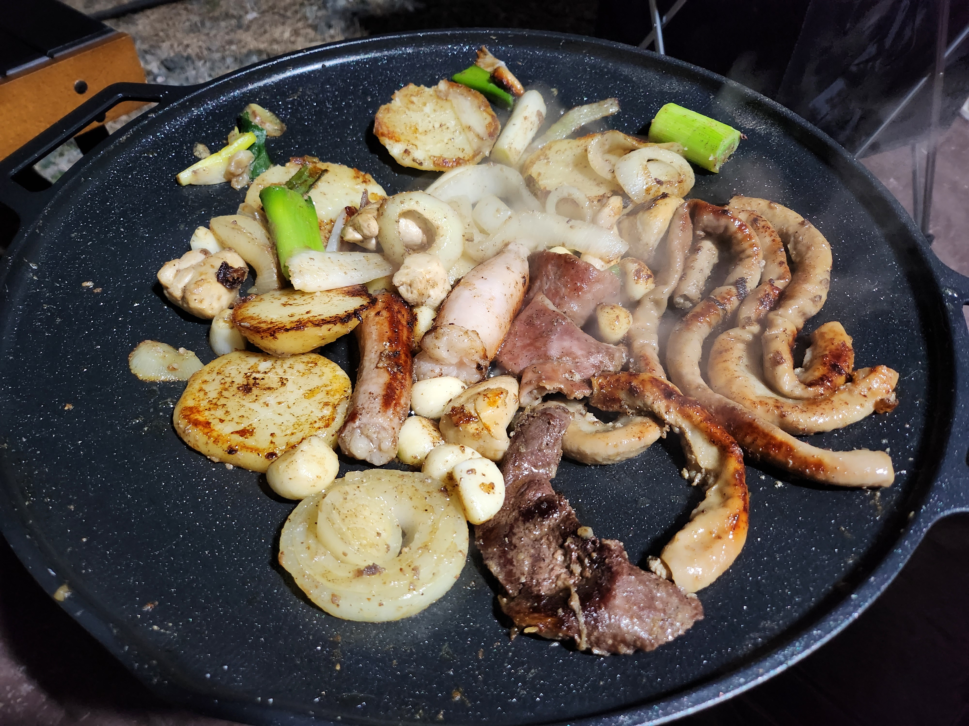 저희는 가져간 감자, 마늘, 양파, 대파, 버섯을 준비하여 중불에서 잘 구워 먹었습니다.