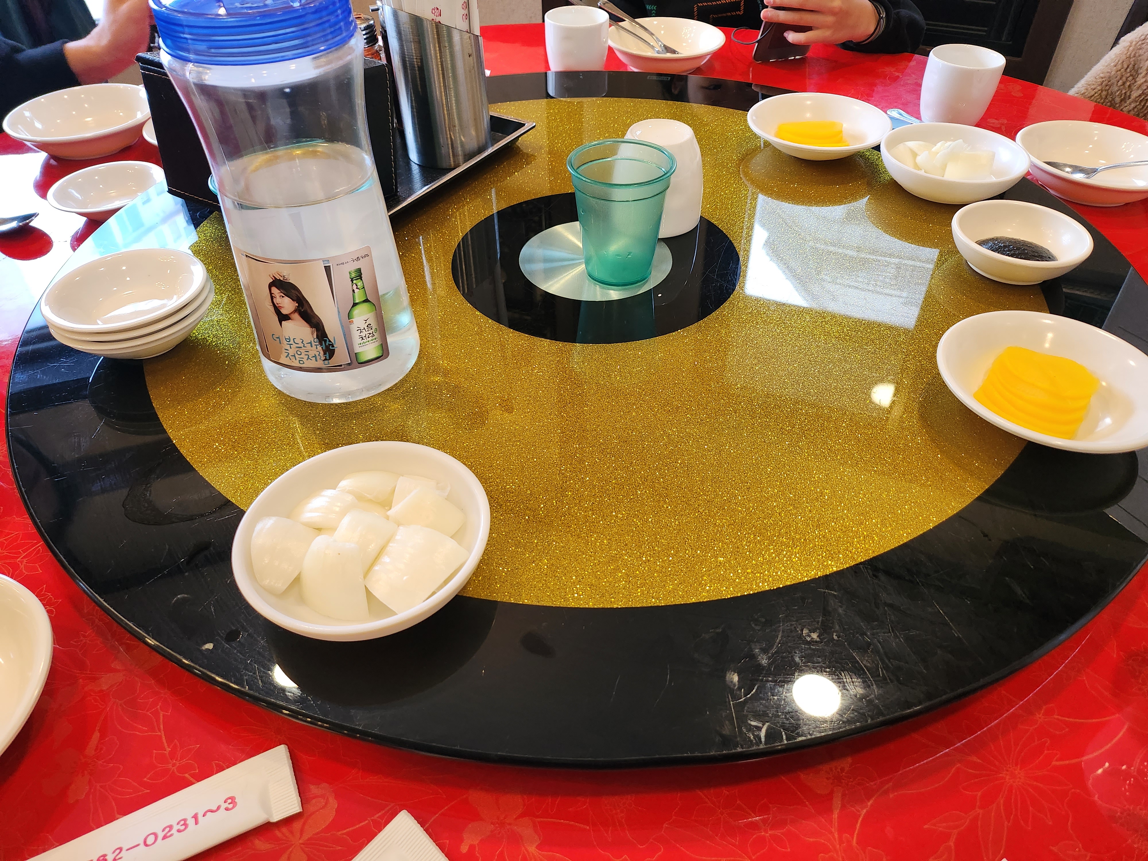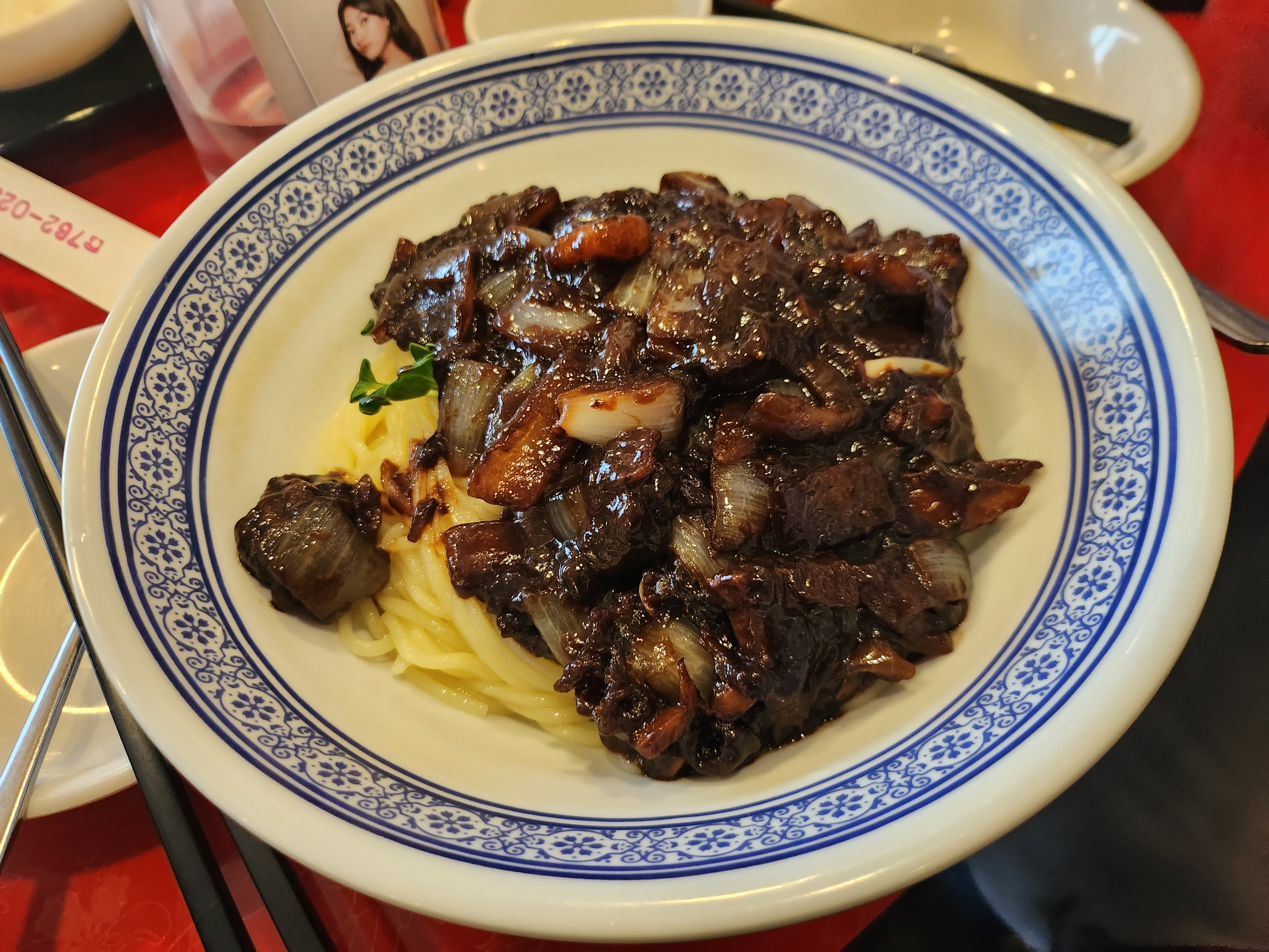 기본 반찬은 단무지, 양파, 춘장입니다.