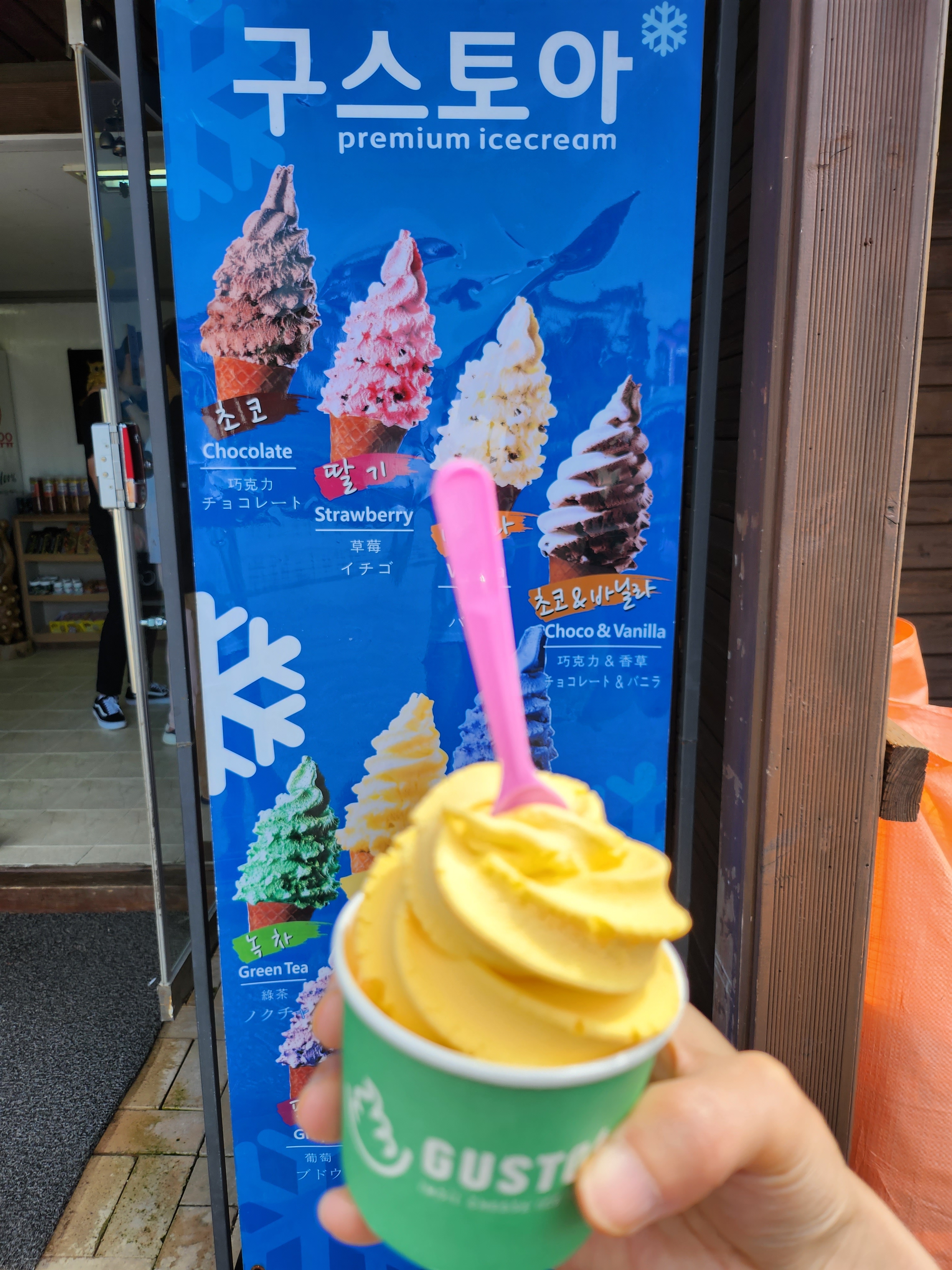 다양한 맛(초코, 딸기, 바닐라, 녹차 등)이 있고 캡슐을 선택한 후 직원분께 드리면 캡슐을 기계에 넣고 아이스크림을 내려주십니다. 주변에 아이스크림 드시분들이 굉장히 많이 보입니다.