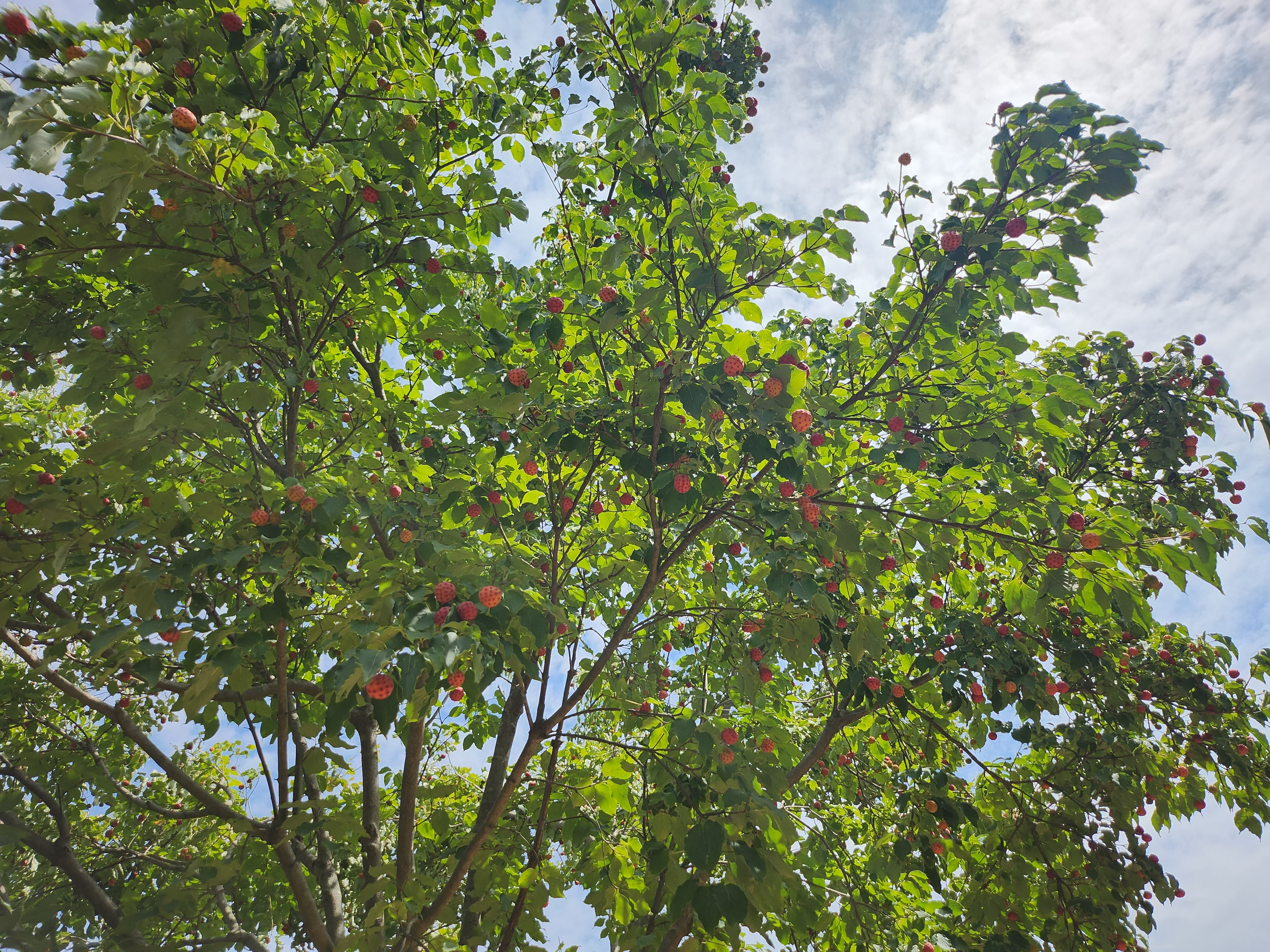산딸나무로 딸기 모양의 열매들이 나무에 주렁주렁 매달려 있었습니다.