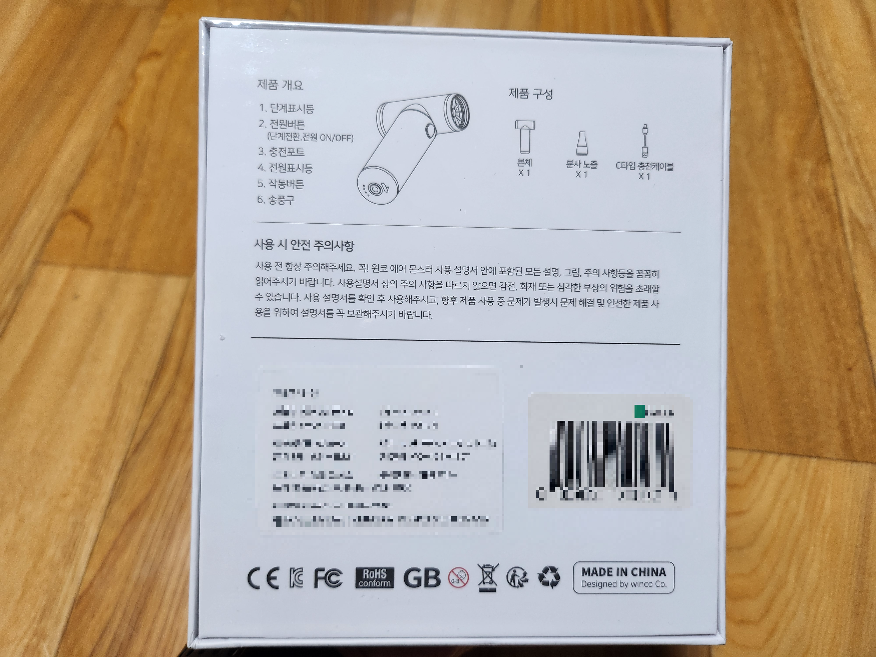 개봉하기전 박스의 모습입니다. 박스 뒤쪽에는 구성품과 주의사항 스펙에 대해 적혀있습니다.