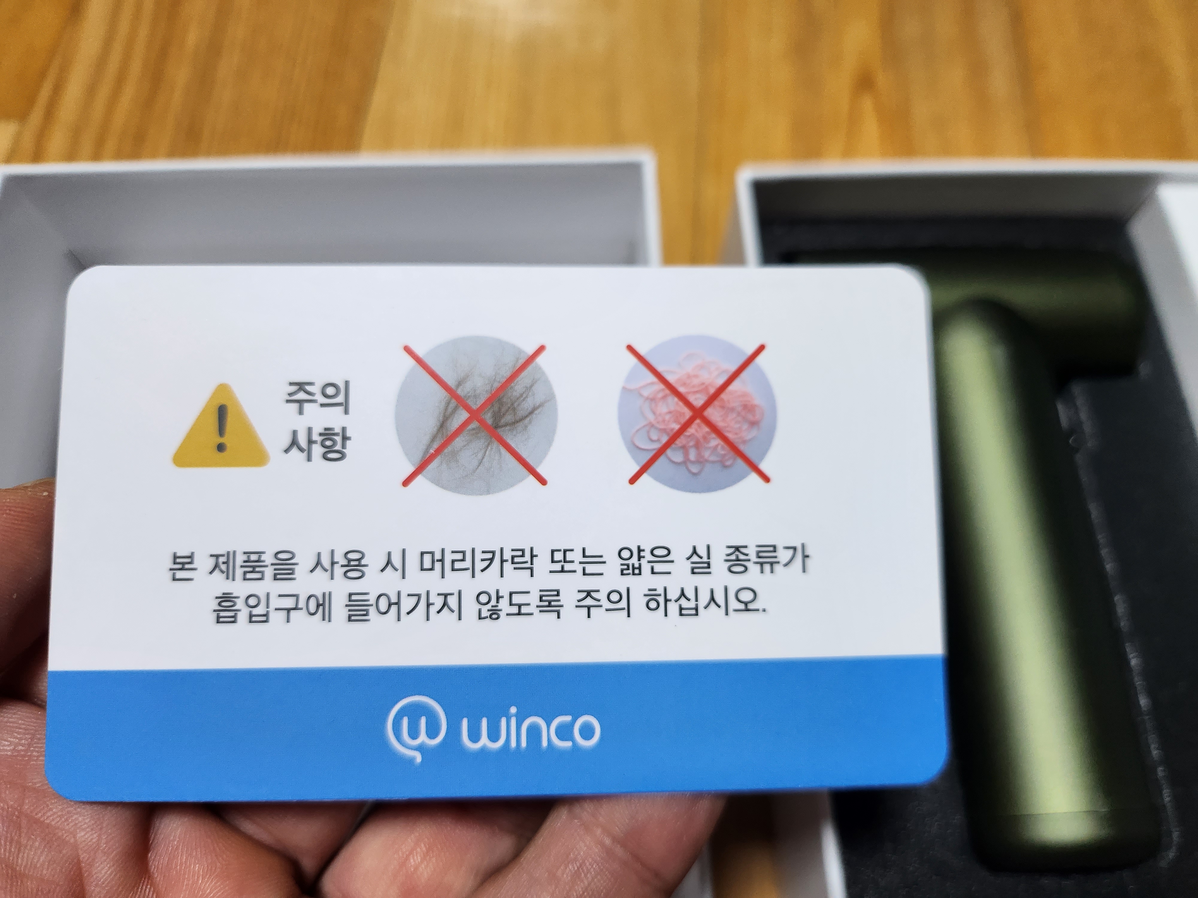 팬이 돌아가는 구조이기 때문에 제품 팬쪽에 머리카락이나 얇은 실 종류가 흡입구쪽에 들어가지 않게 주의하라는 문구가 카드형식으로 들어있었습니다.