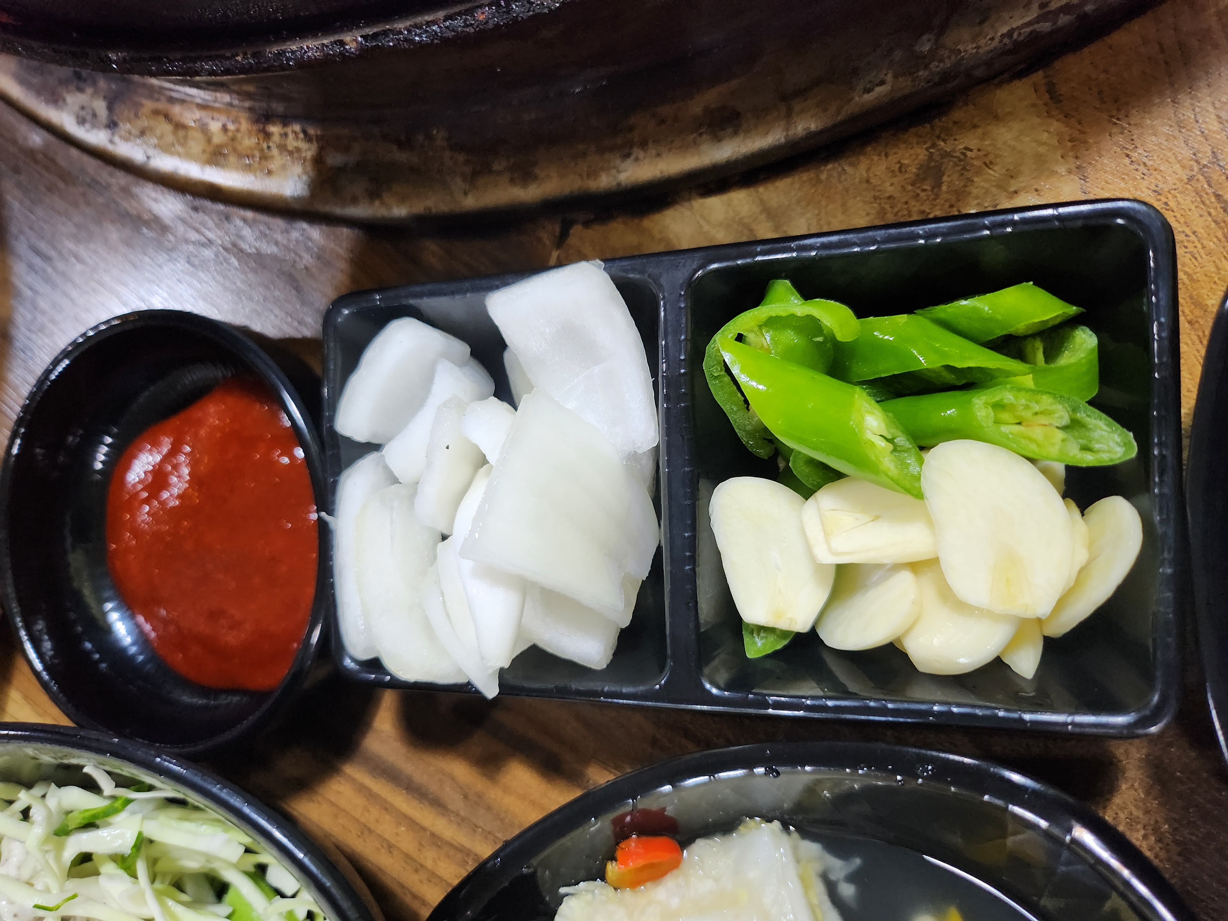 쌈을 쌀 때 넣어 먹을 수 있는 고추장 소스, 양파, 고추, 마늘을 제공하고 있습니다.